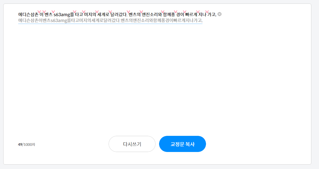 한가지 놀라운 점은 s63amg를 대문자인 S63AMG로 변경해줬다는 것이다. 그러나 문장별로 띄어쓰기를 해준것이 아니라 몇개의 단어들만 선택적으로 교정해주는 점은 다소 아쉽다. 하지만 일단 문장이 길어도 교정이 된다는 점에서 다음보다는 괜찮은 결과라 생각된다.