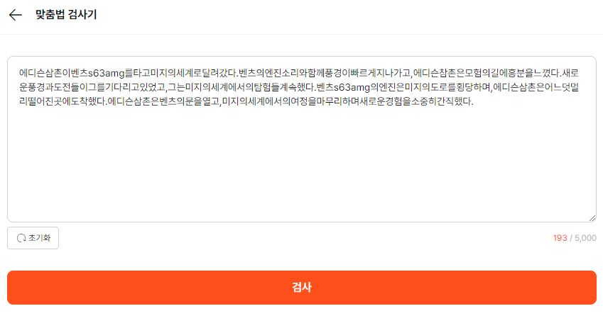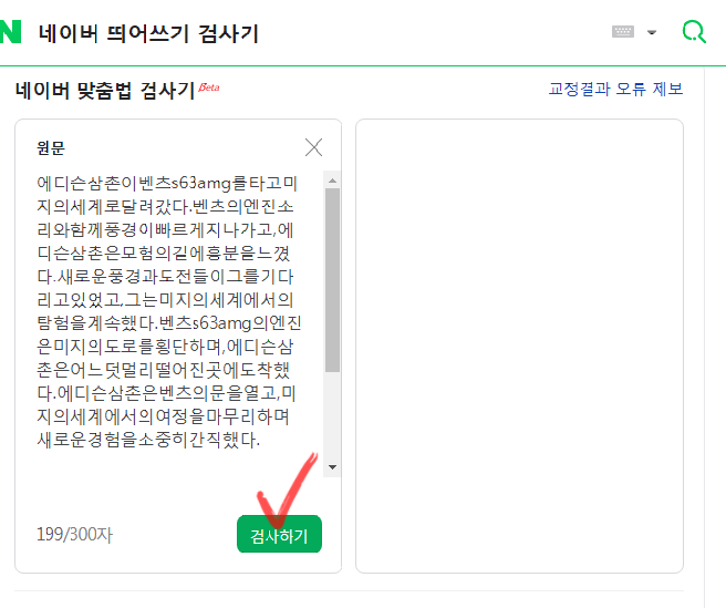 부산대검사기와 마찬가지로 동일한 문장을 붙여넣고, 하단의 검사하기 버튼을 누른다.