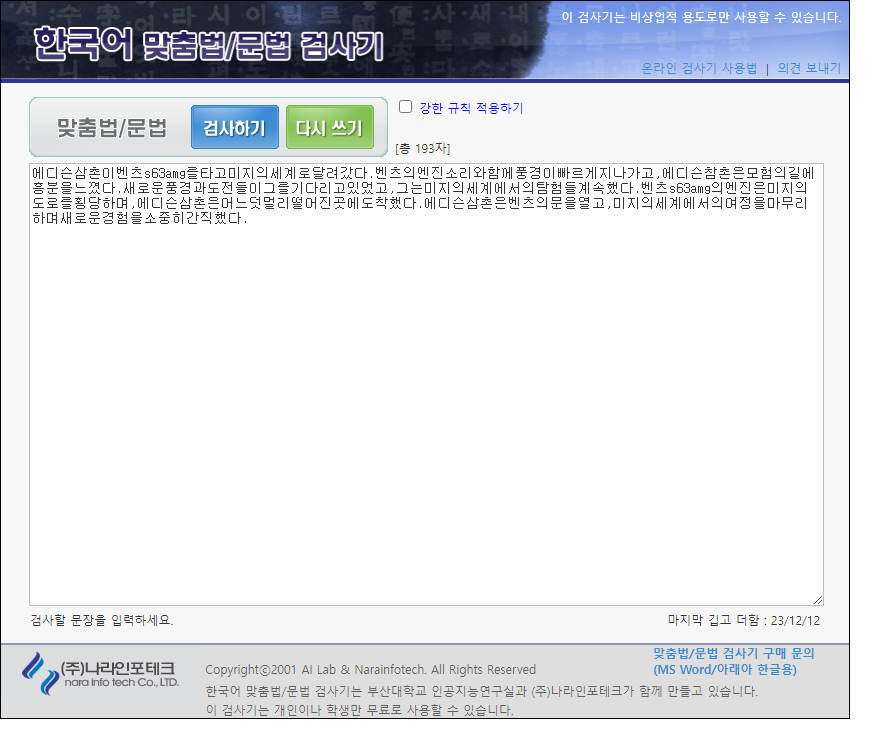 Copyrightⓒ2001 AI Lab & Narainfotech. All Rights Reserved 한국어 맞춤법/문법 검사기는 부산대학교 인공지능연구실과 (주)나라인포테크가 함께 만들고 있습니다. 이 검사기는 개인이나 학생만 무료로 사용