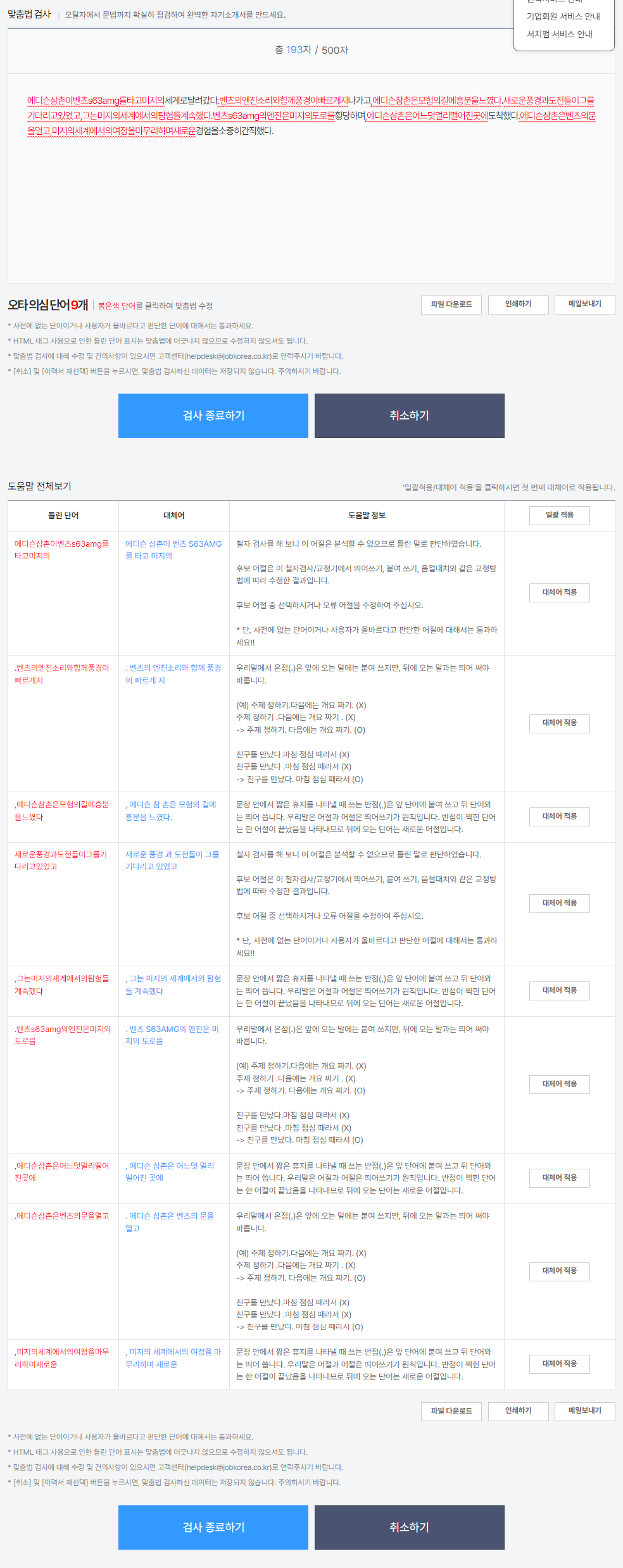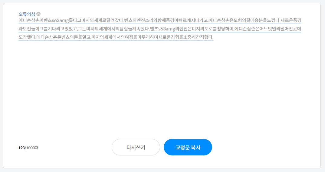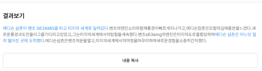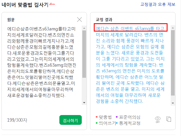 그러면 [교정 결과]가 나오는데, 결과를 첫번째 문장의 띄어쓰기가 제대로 되지 않았을 뿐만아니라, 단어도 잘못 교정되었다.