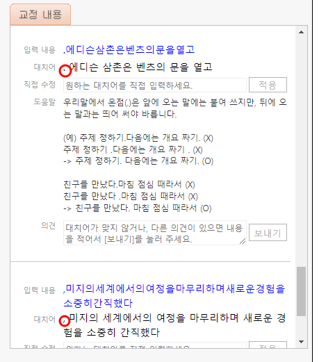 특히 부산대 맞춤법 검사기는 , 오른쪽 [교정내용]에 [직접수정]란이 있어서 혹시 교정이 잘못된 경우 정답을 입력하면 이를 데이터베이스에 반영한다고 한다.