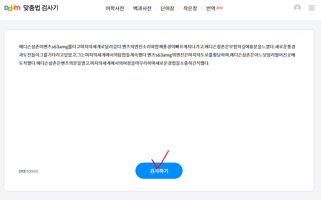 다음검사기와 마찬가지로 동일한 문장을 붙여넣고, 하단의 검사하기 버튼을 누른다.