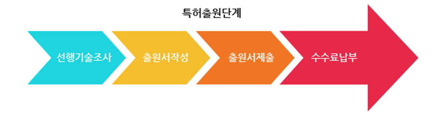특허출원은 선행기술조사, 특허출원서작성, 특허출원서제출, 수수료납부의 4단계로 이루어진다.