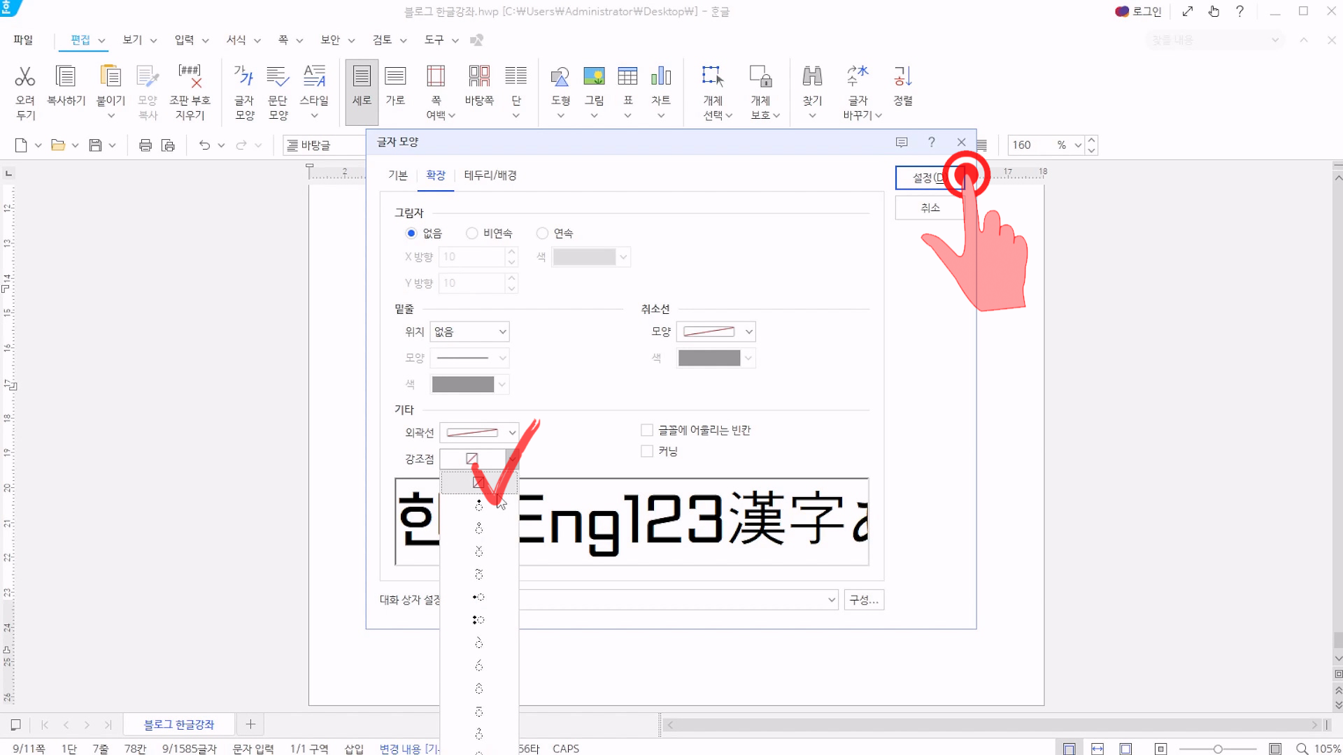첫번째는 글자 위에 검정점이고 그외에도 검정점의 위치가 다르거나, 체크표시 등 강조점의 모양이 다양하니 원하는 모양을 선택하고 [설정]을 누르면 끝!