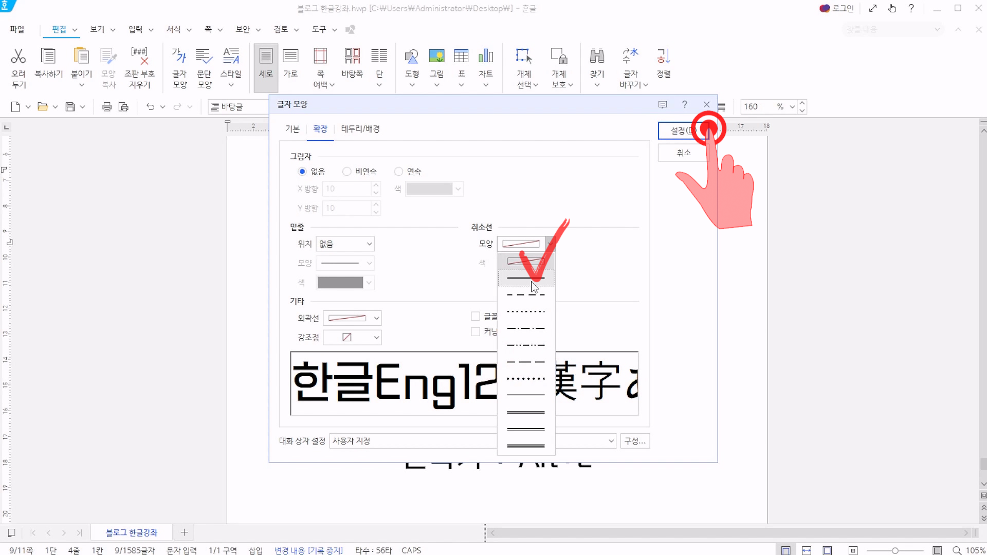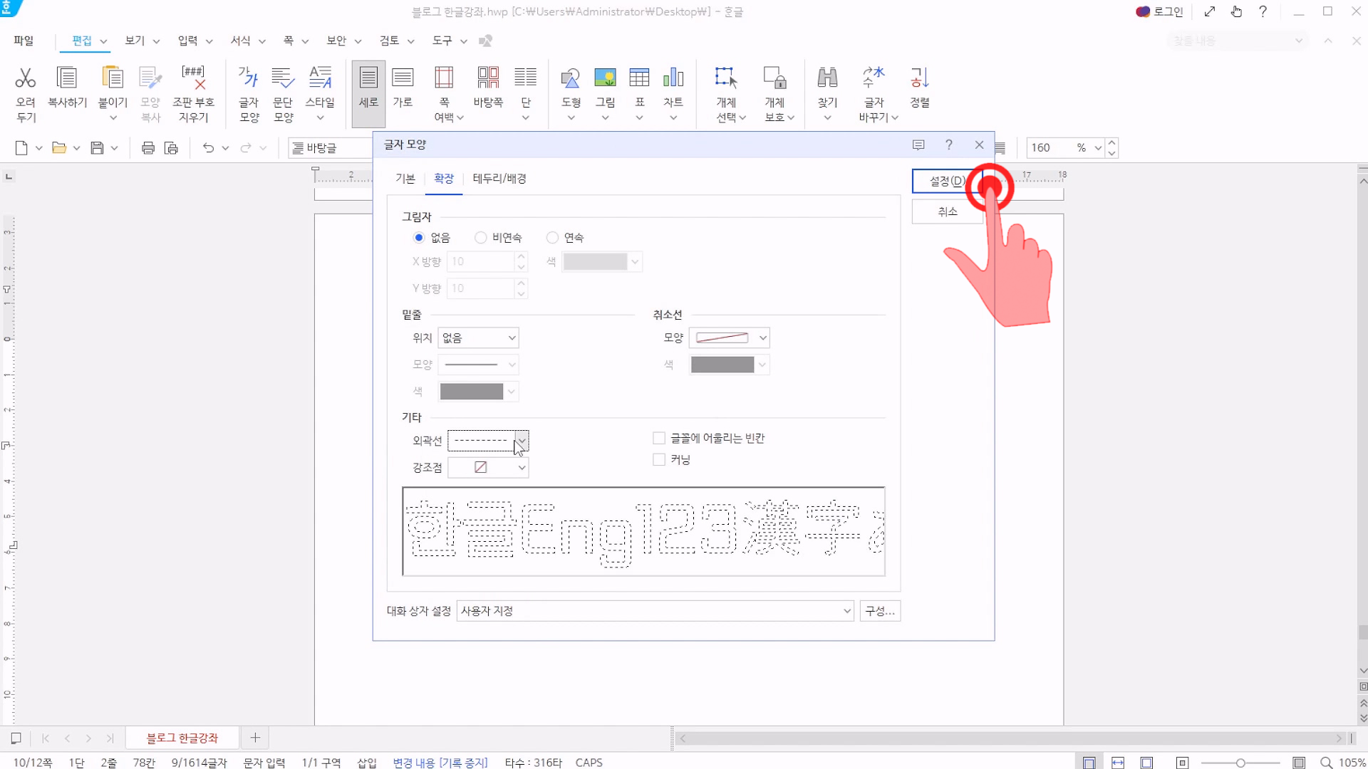 또는 글자 외곽선을 점선으로 변경할 수 도 있고, 자신이 마음에 드는 것으로 선택하시길 바란다.