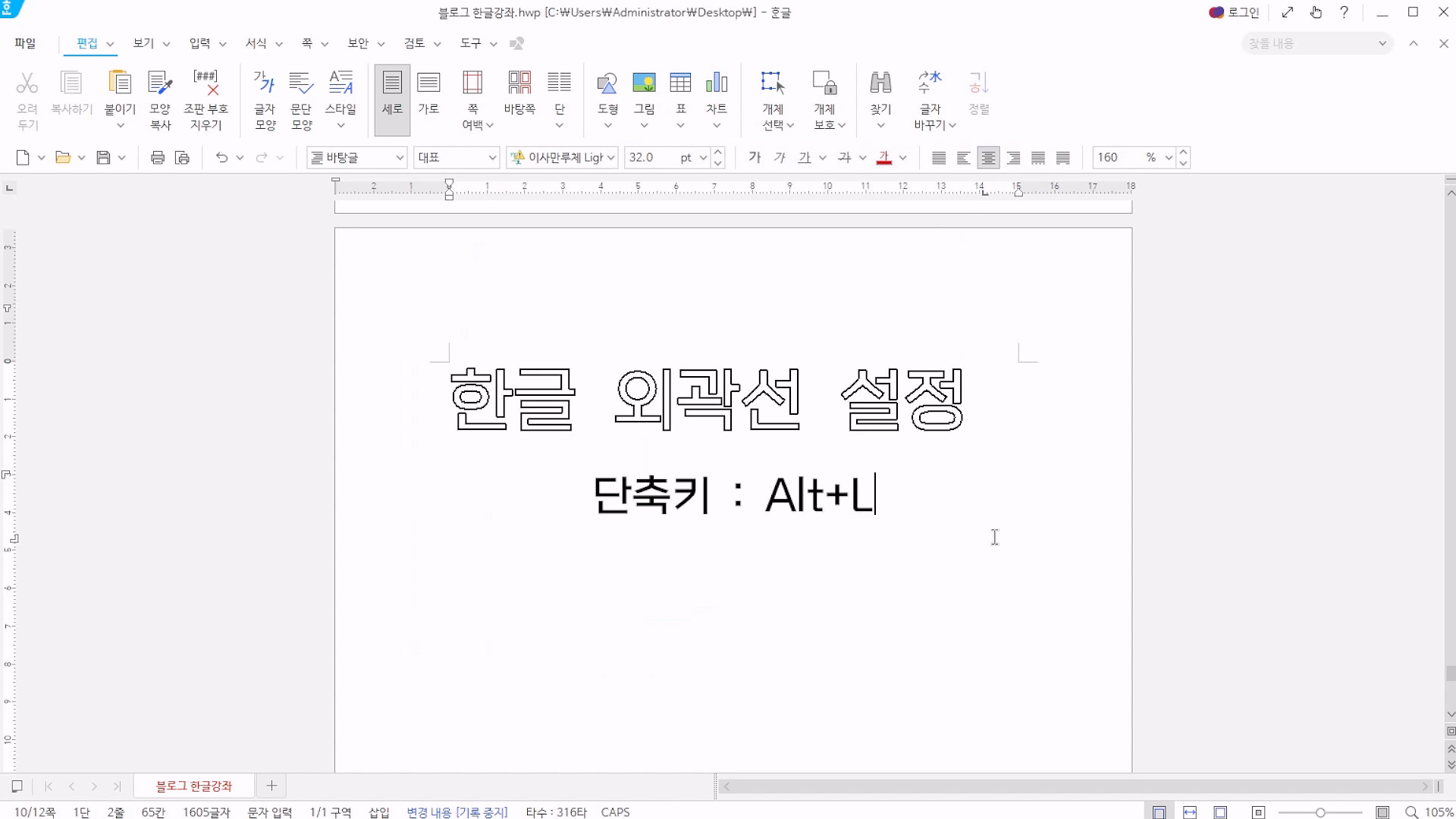 글자에 외곽선을 넣는 방법은 역시 단어를 먼저 드레그 한후 Alt+L을 누른다.