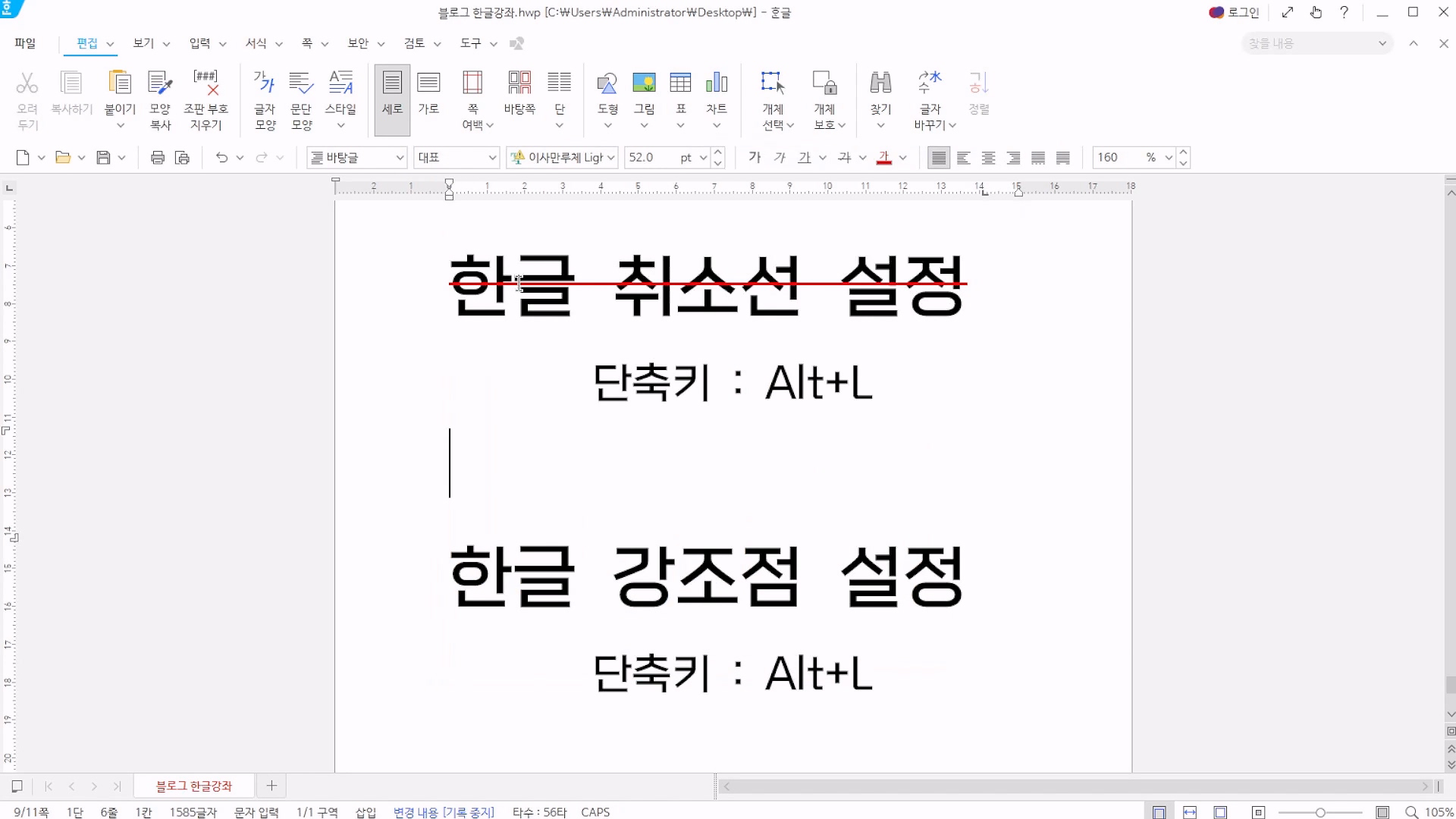 한글 문서 작성시 타이틀을 본문보다 강조하고 싶을 때가 있다. 이럴때 필요한 기능이 바로 그림자, 강조점 또는 글자 외곽선이다. 그리고 이벤트 마감을 표시할때 취소선을 써서 그 이벤트가 종료되었음을 알리기도 한다.