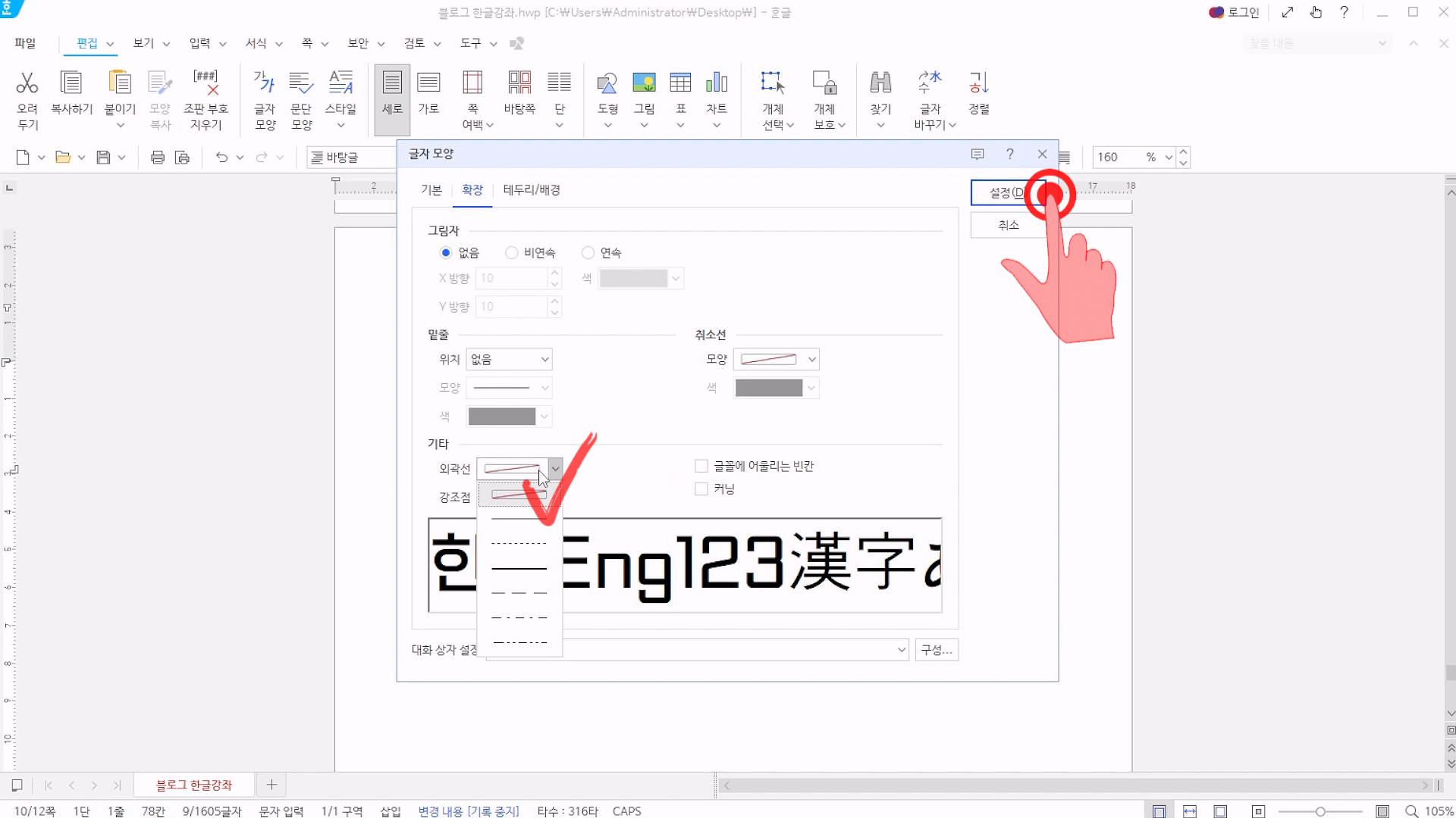 [글자모양]-[확장]-[기타]-[외곽선]에서 원하는 외곽선의 모양을 선택하면 된다. 가장 일반적인 실선을 선택해보자.