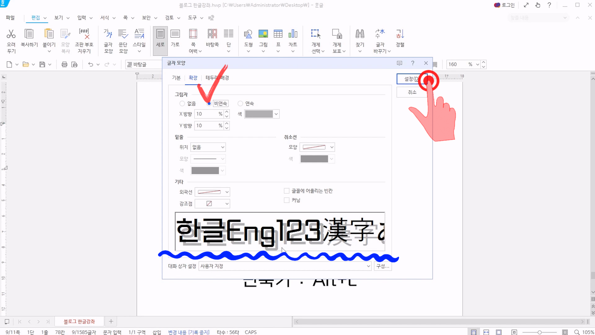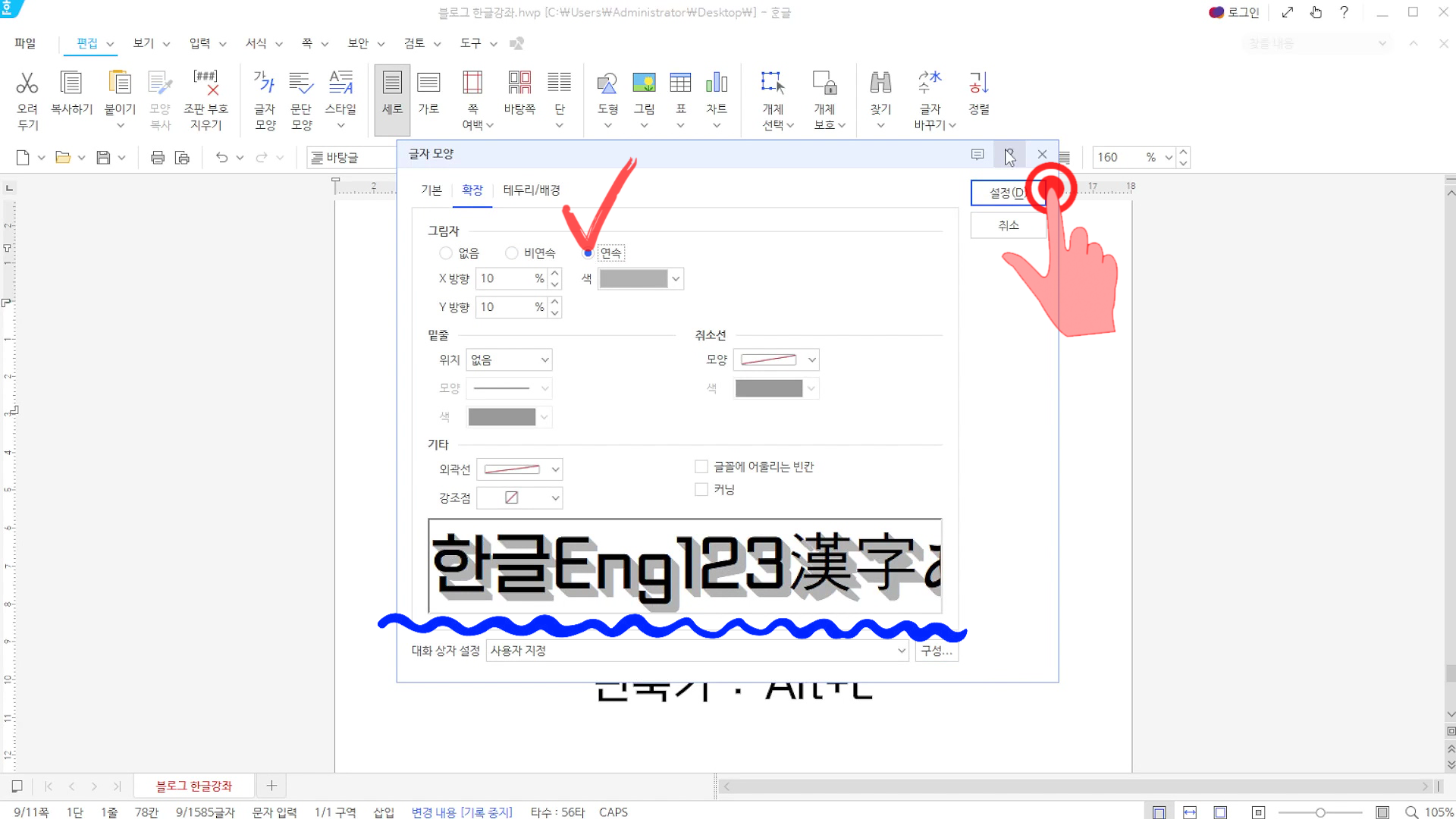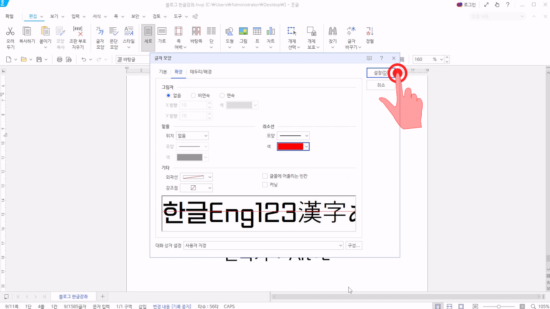 이렇게 글자모양을 바꿈으로써 글씨의 느낌을 완전히 바꿀 수 있기 때문에, 글자모양은 중요하다. 그럼 같이 한글 그림자, 강조점, 외곽선 및 취소선 설정방법에 대해서 알아보자.