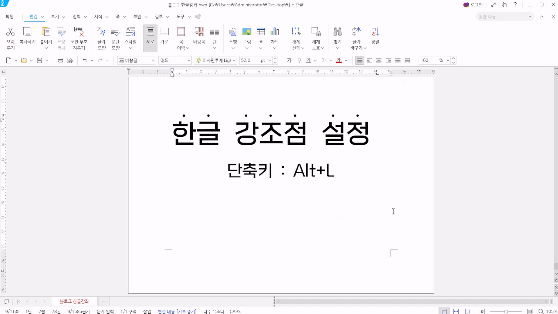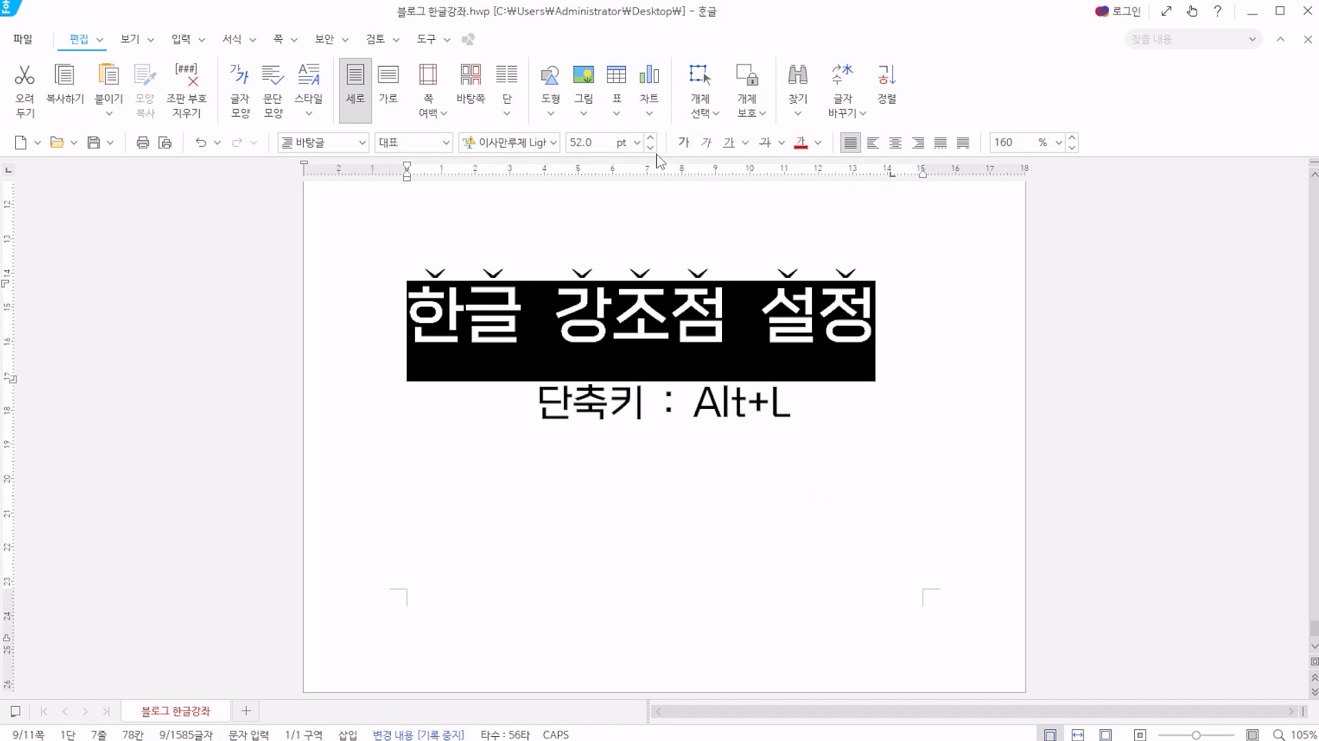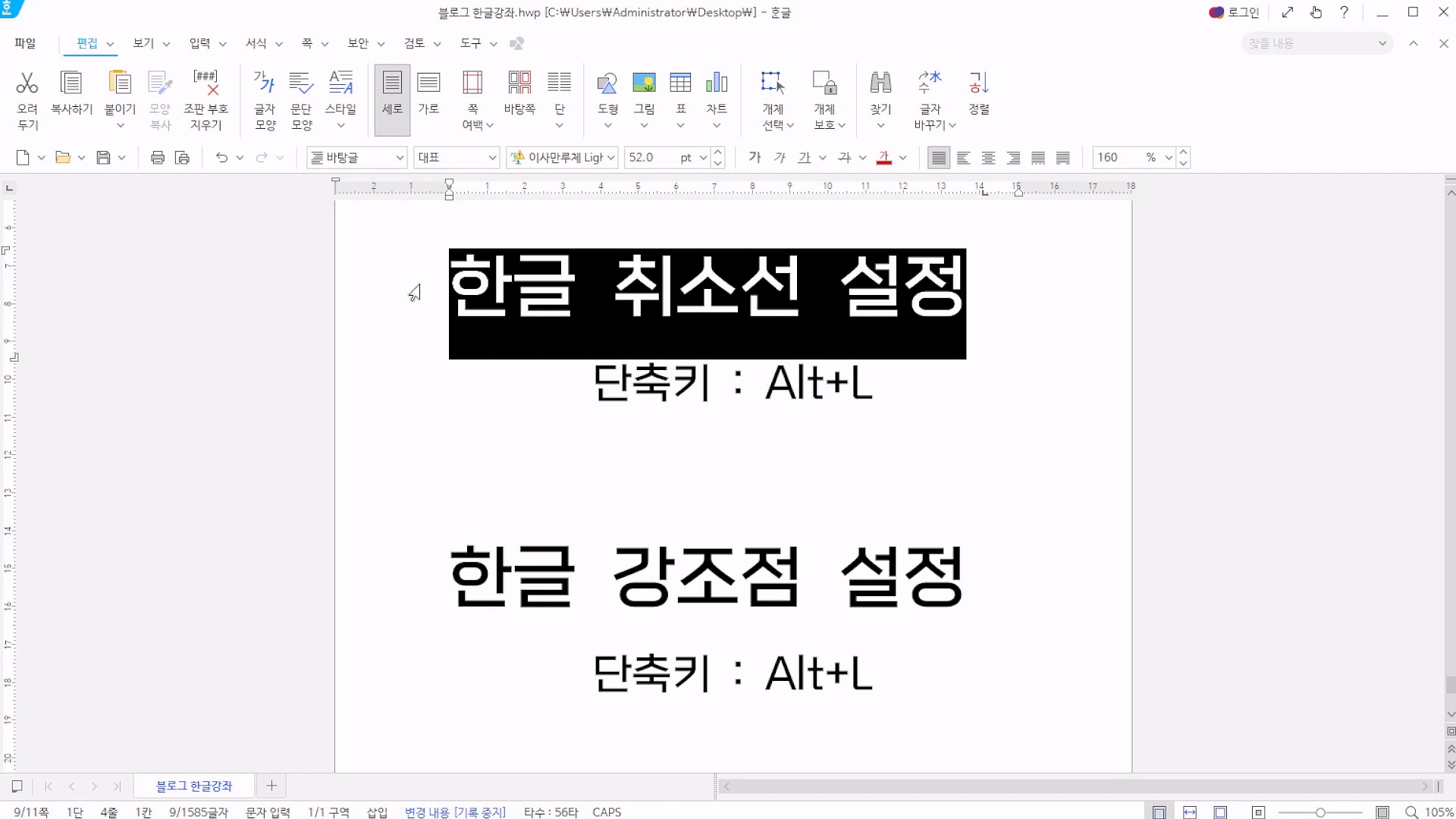 이 방법 역시 글자를 먼저 드레그하여 선택한 다음 Alt+L을 눌러 글자모양으로 들어가자.