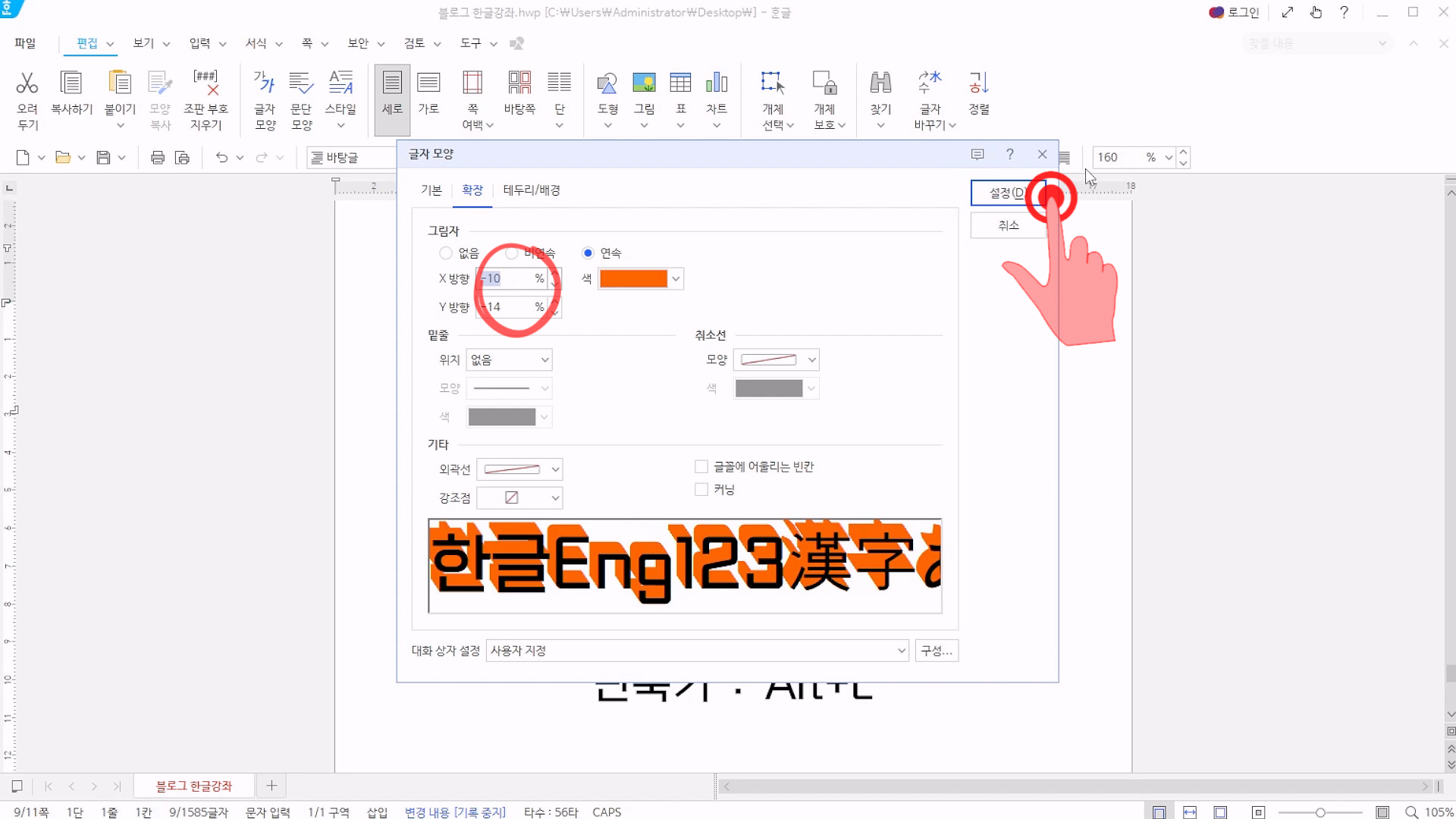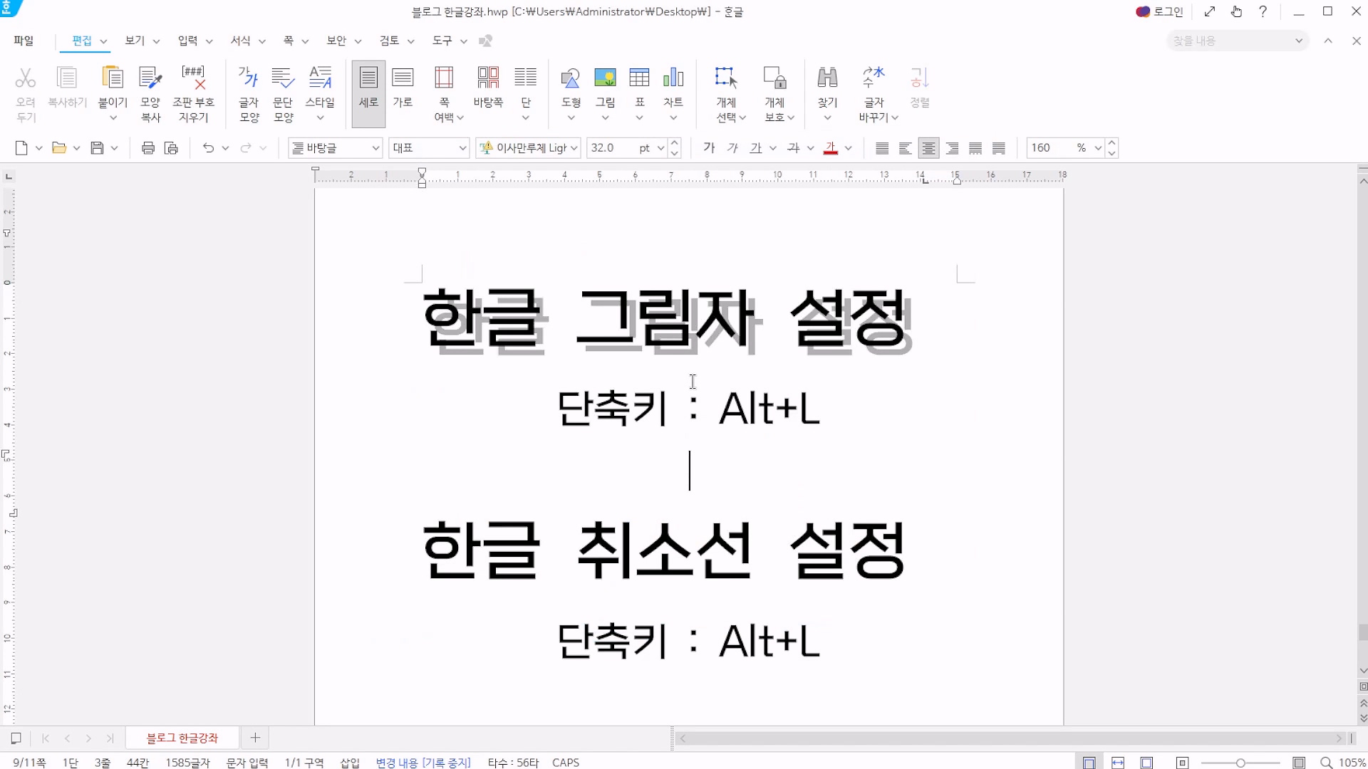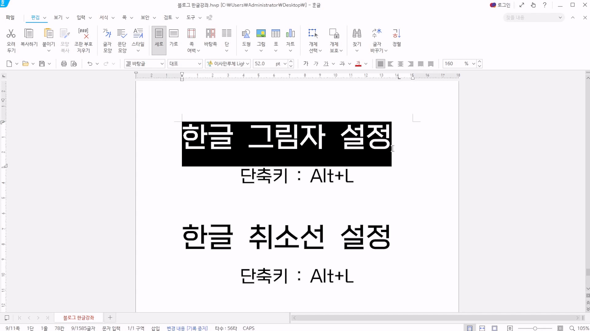 글자 그림자 넣는 단축키는 글자모양을 띄우는 Alt+L이다. 우선 글자를 드레그 하여 선택하고 Alt+L을 눌러보자.