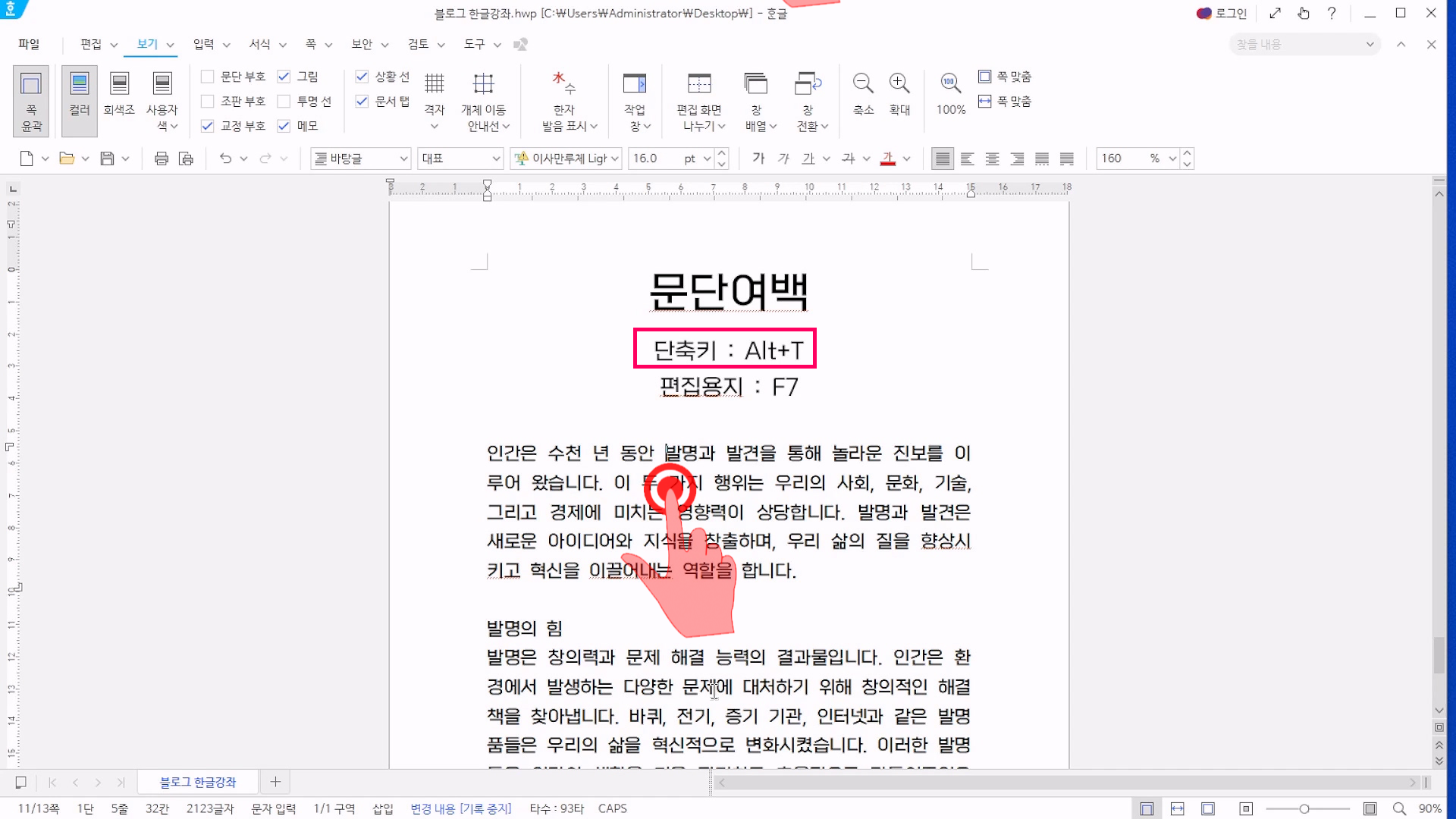 한글 문단여백을 설정하는 단축키는 Alt+T이다. 여백을 설정하고자하는 문단을 먼저 클릭한 상태에서 편집을 시작하면 된다. 그러면 [문단모양] 창이 팝업된다.
