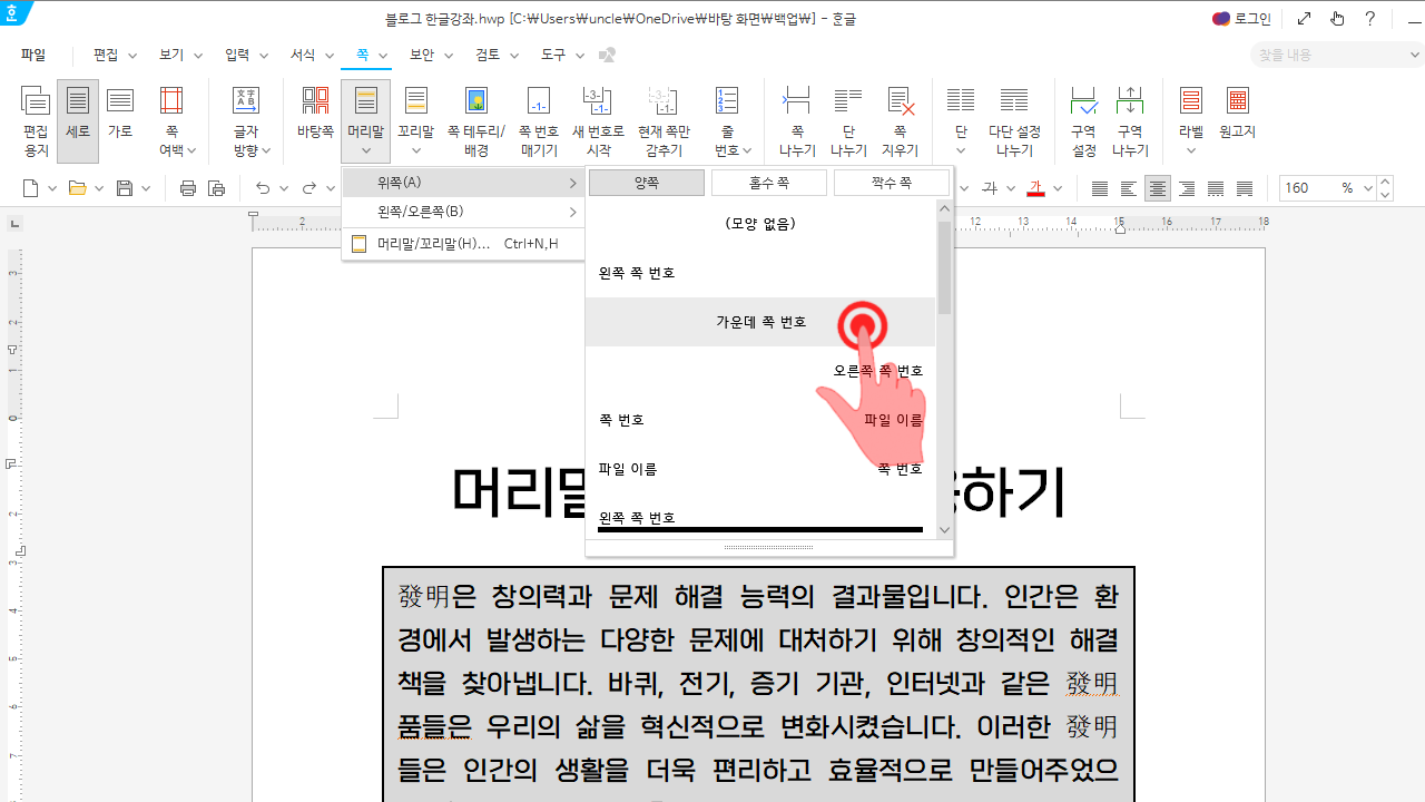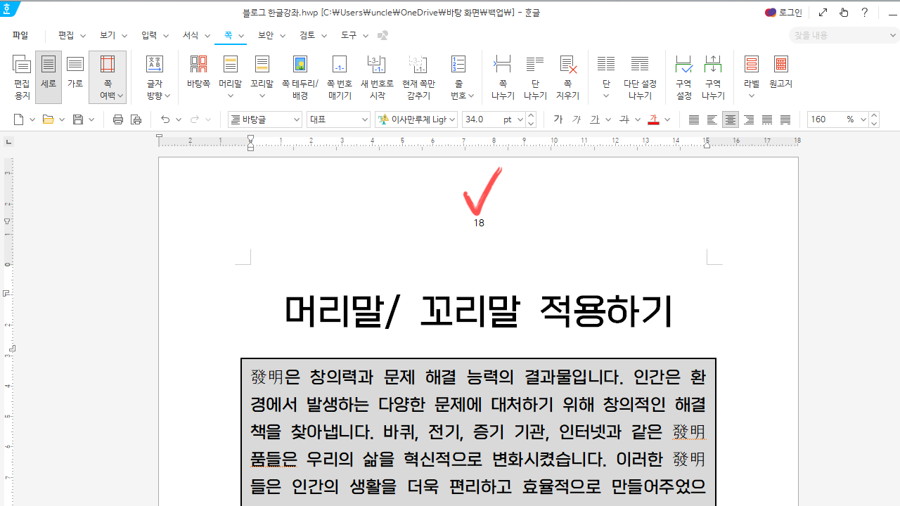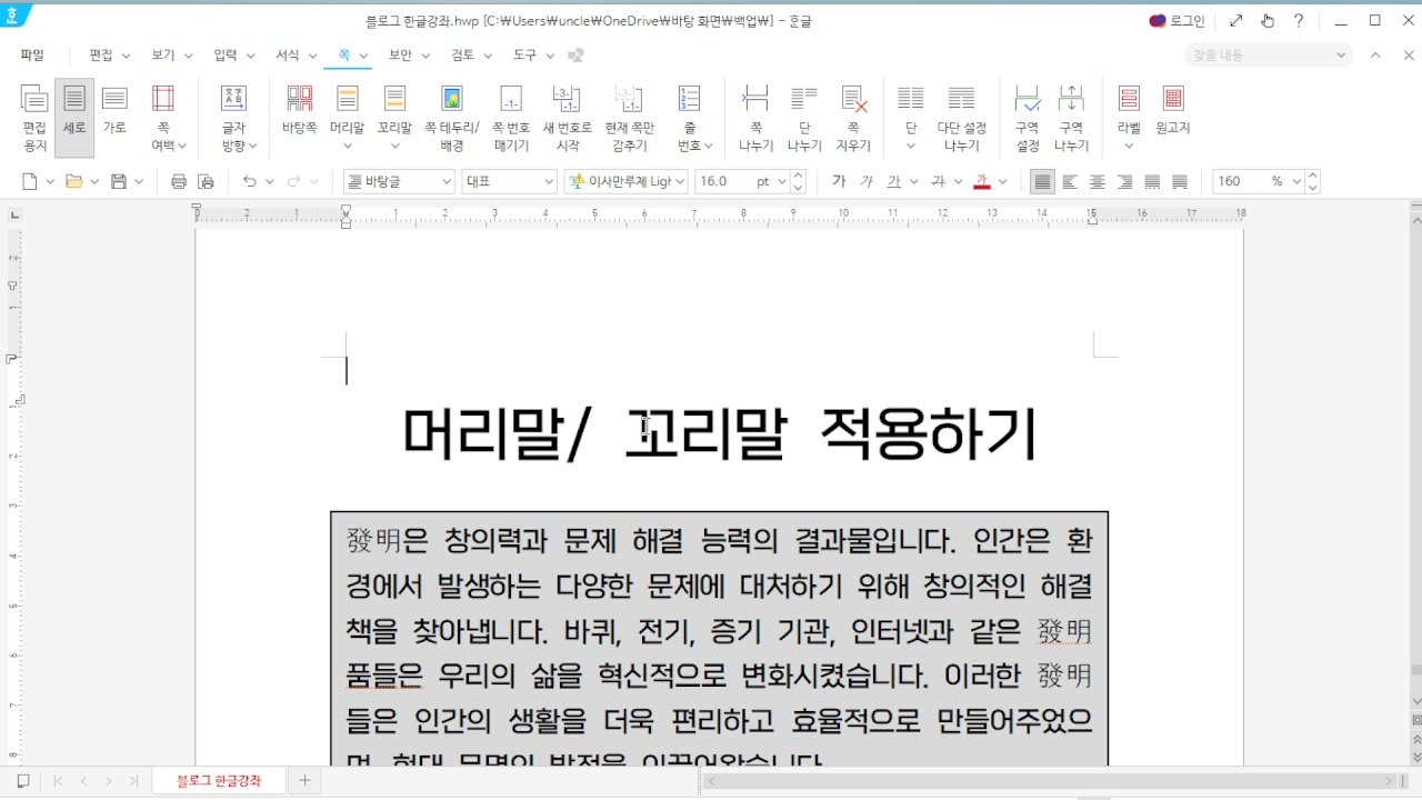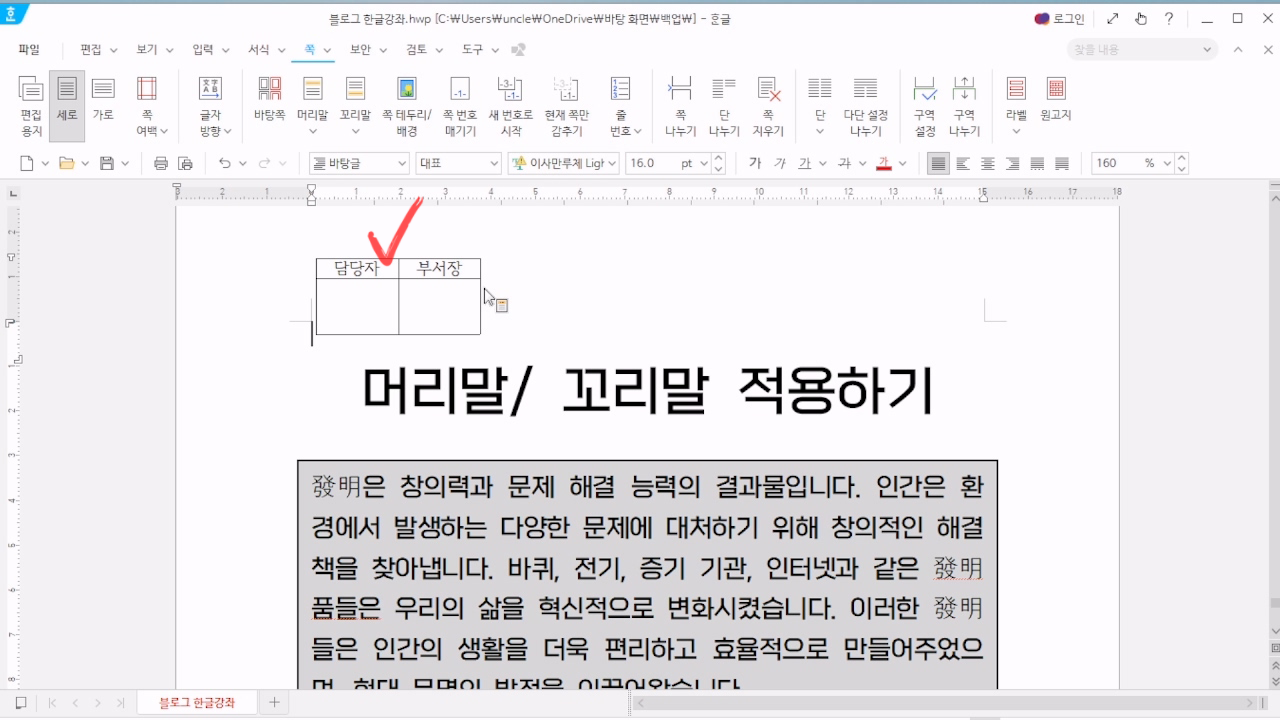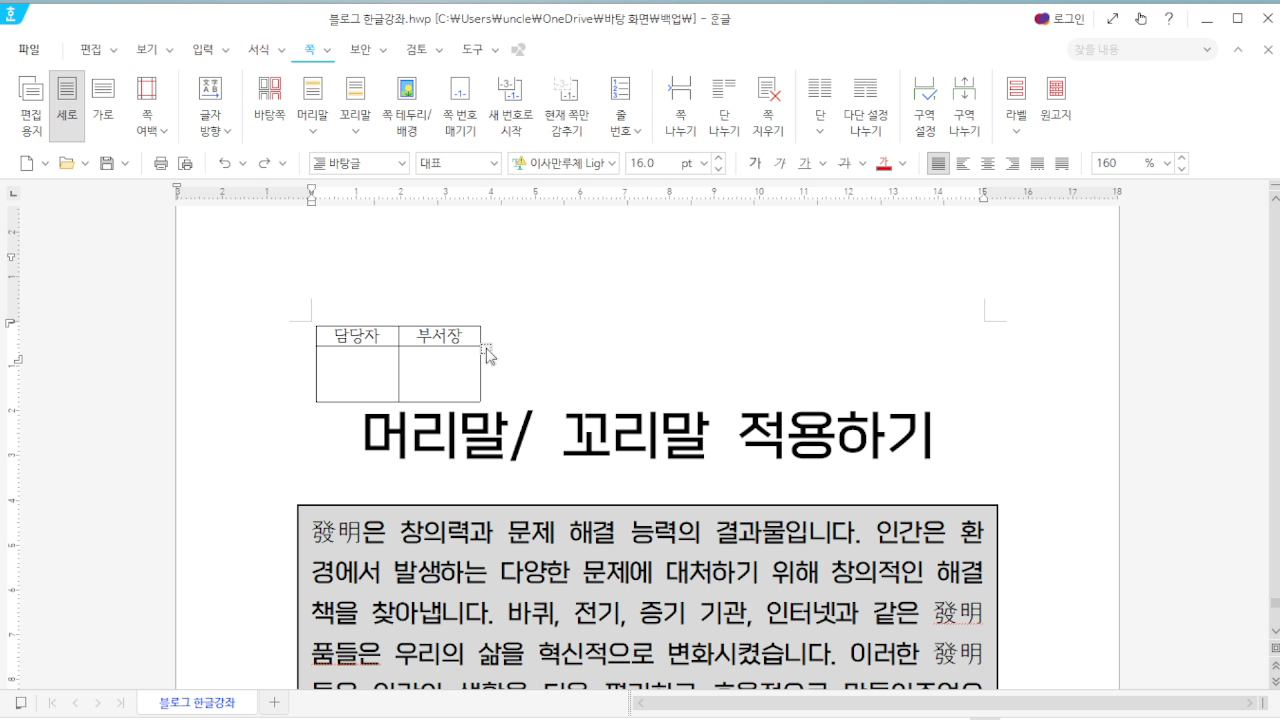 한글 머리말 넣기