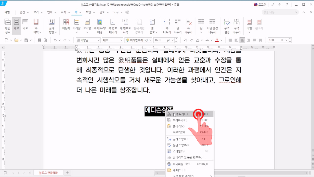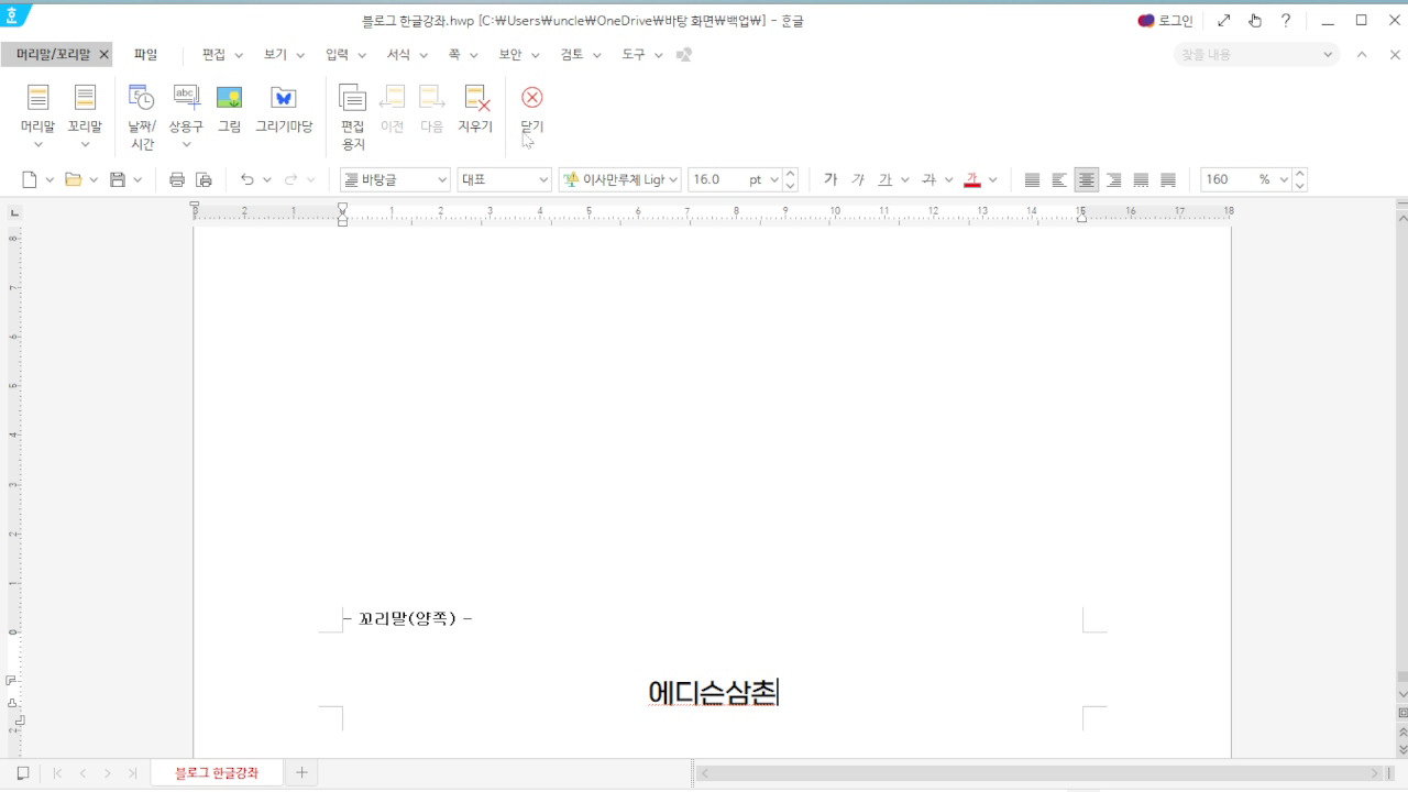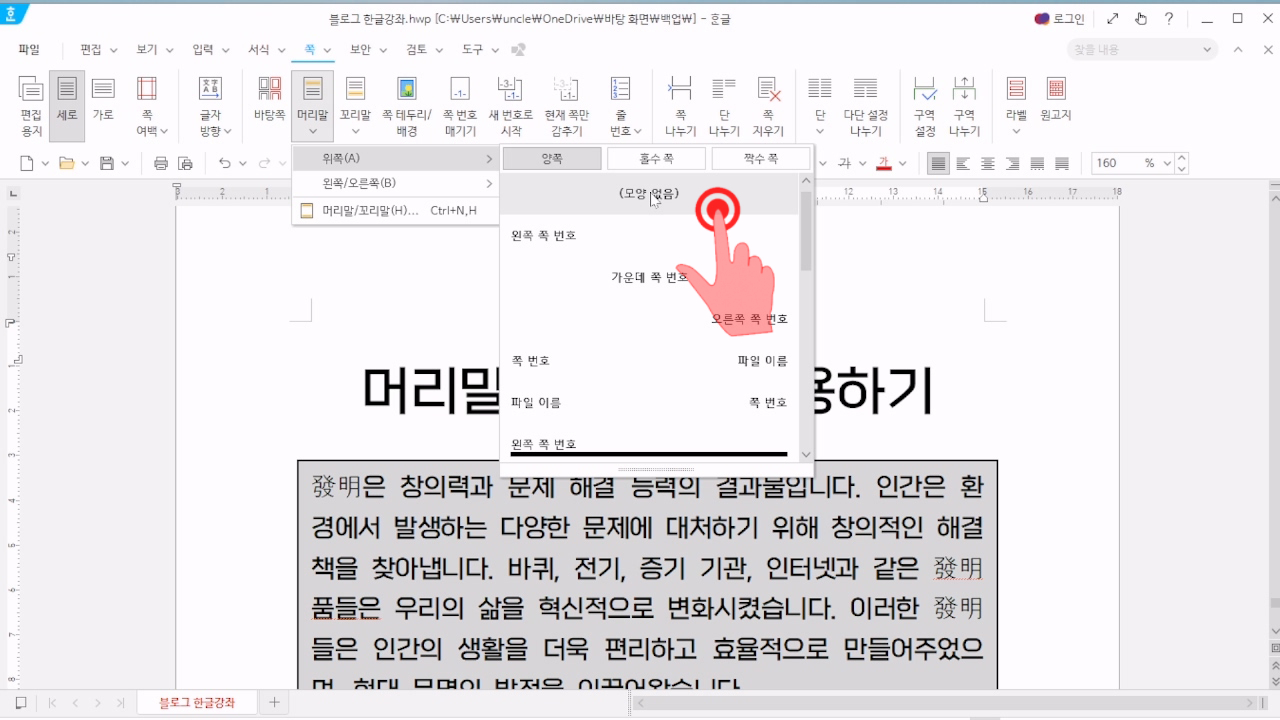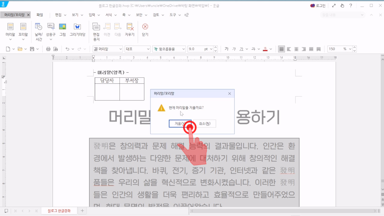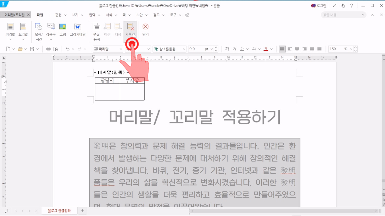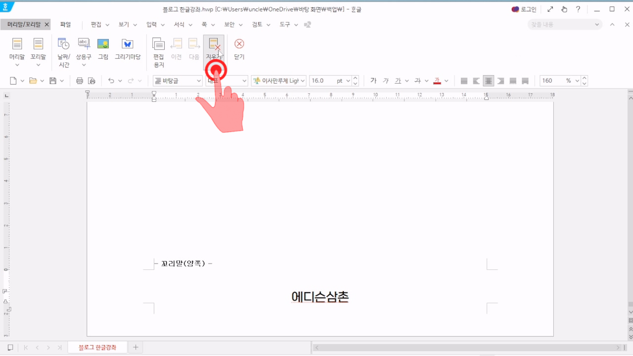 한글 머리말 삭제 편집하기