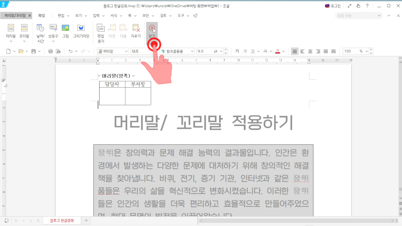 Ctrl+V를 눌러서 오려둔 결제란을 아래와 같이 붙여넣기 해주자. 그리고 [머리말/꼬리말]에서 [닫기]를 누르자.