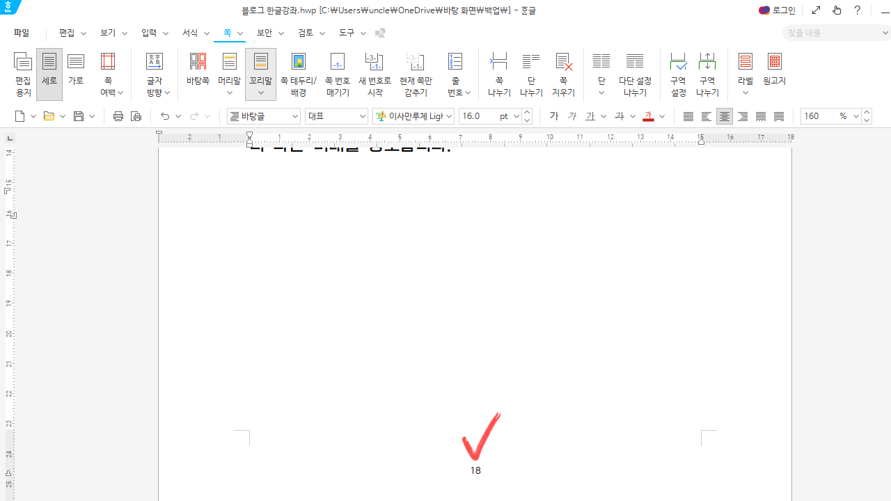 그러면 아래와 같이 꼬리말 가운데에 쪽번호가 삽입된다.