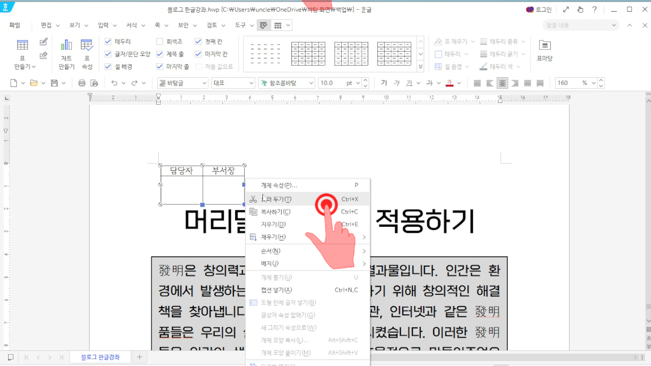 한글 꼬리말 넣는 방법도 머리말 넣기와 비슷하다. 먼저 꼬리말에 넣을 표나 문장 또는 그림을 오려두기 하자.