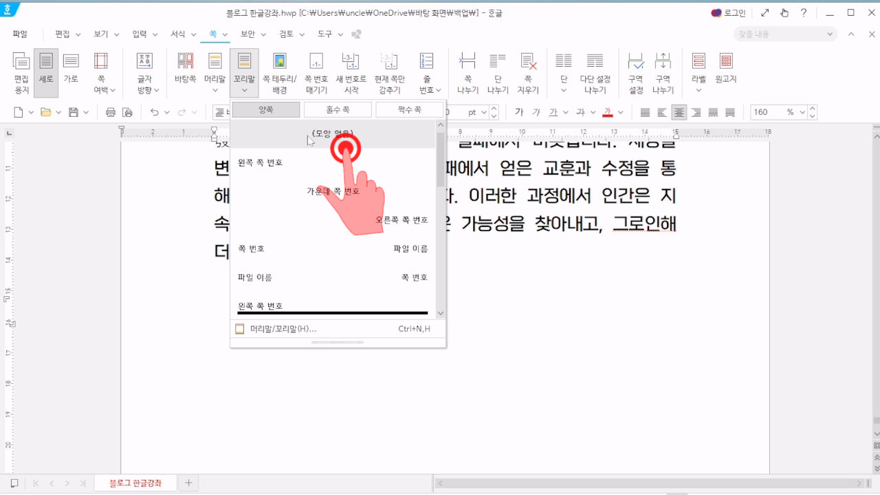 여기에서 페이지의 홀수쪽이나 짝수쪽에만 넣을 수 있고, 양쪽 모두에 꼬리말을 넣을 수 있으니 필요에 따라 선택하면 된다.