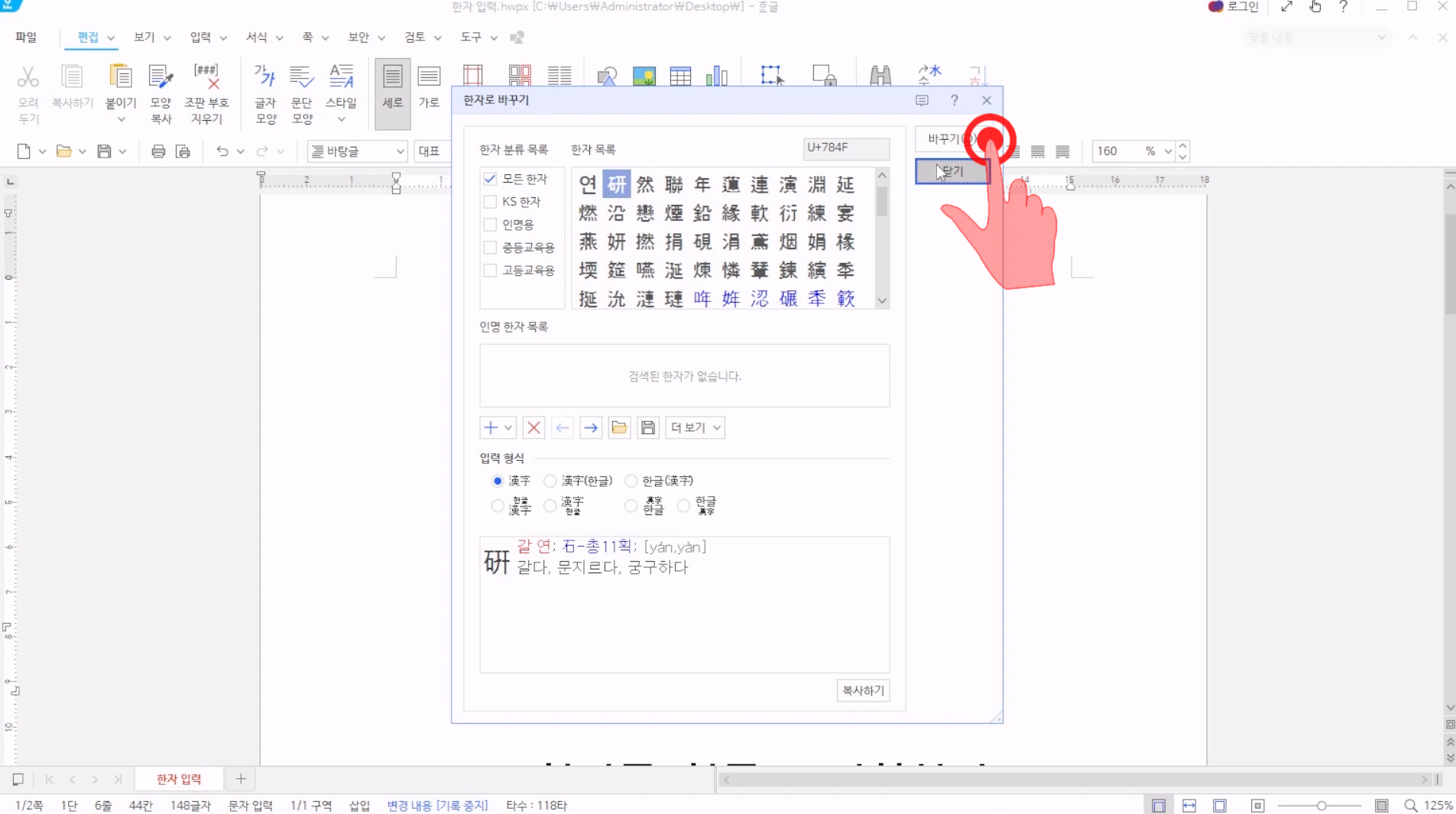그러면 단어를 한글자씩 한자로 변환할 수 있다. 아래 한자 중에 원하는 한자를 선택하고 [바꾸기]