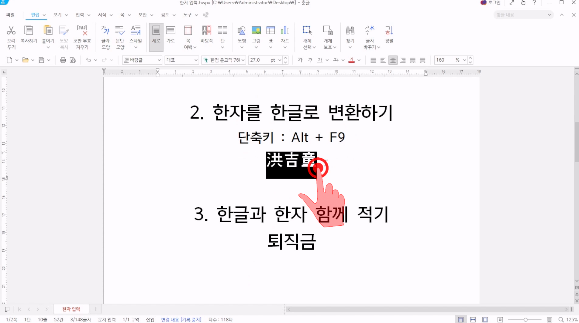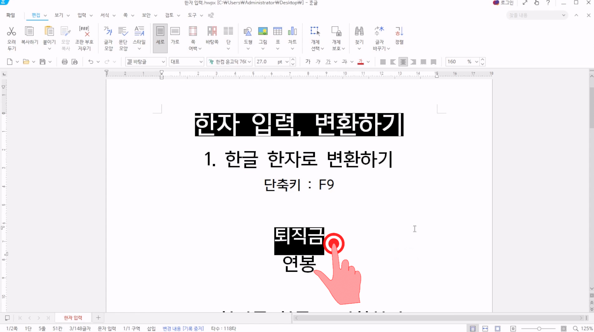 첫번째는, 한글단어를 한번에 한자로 변환하는 방법이다. 한글을 한자로 변환하기 위해서는 변환하고자하는 단어를 아래와 같이 드레그 하고, F9를 누르자.