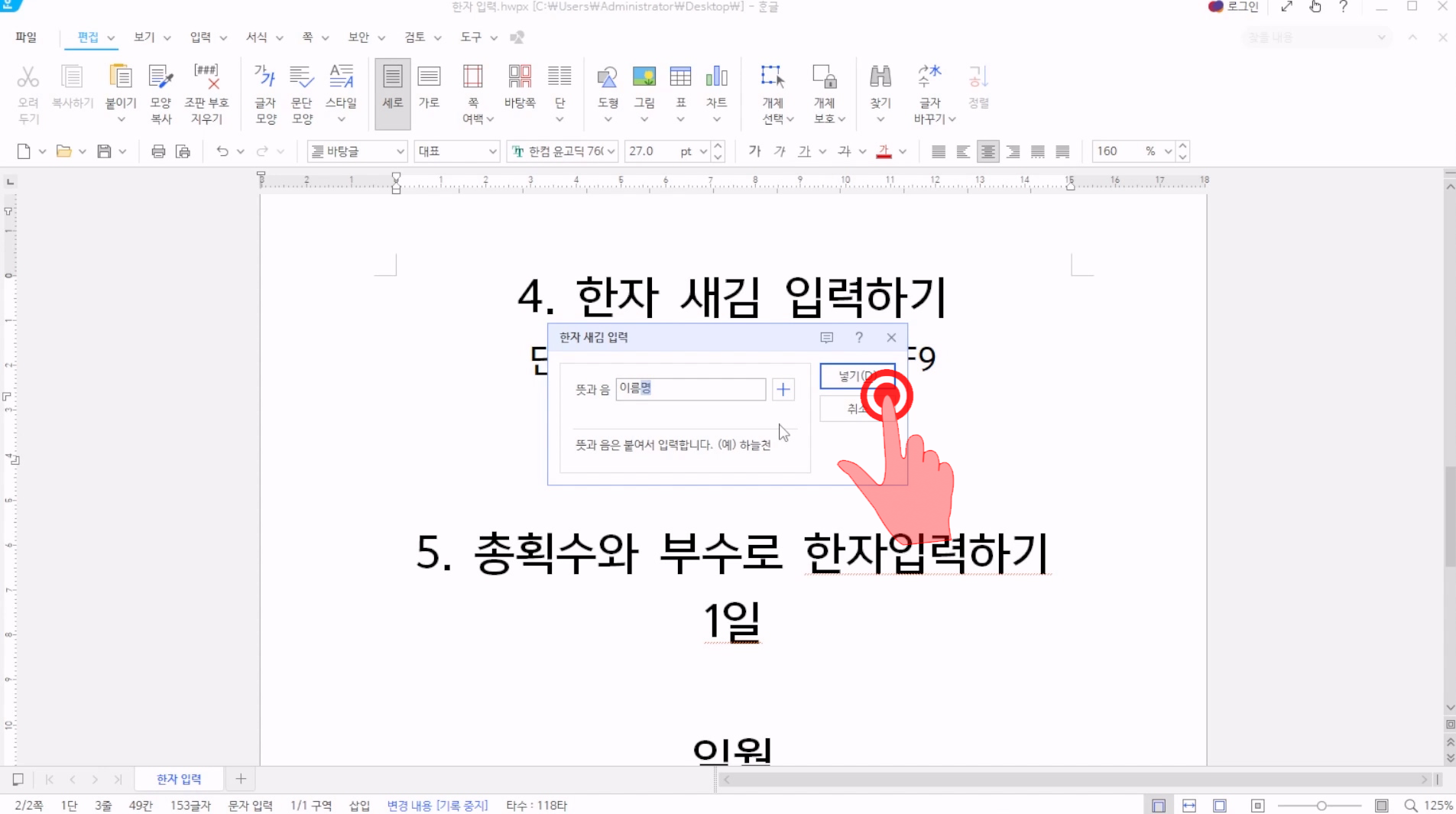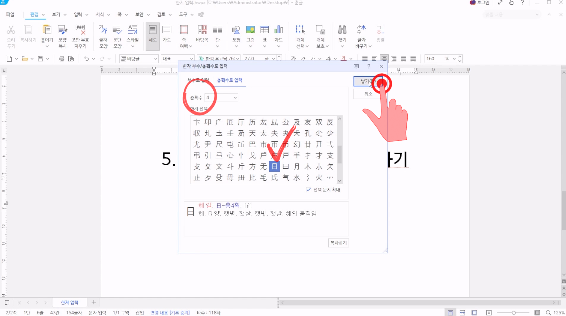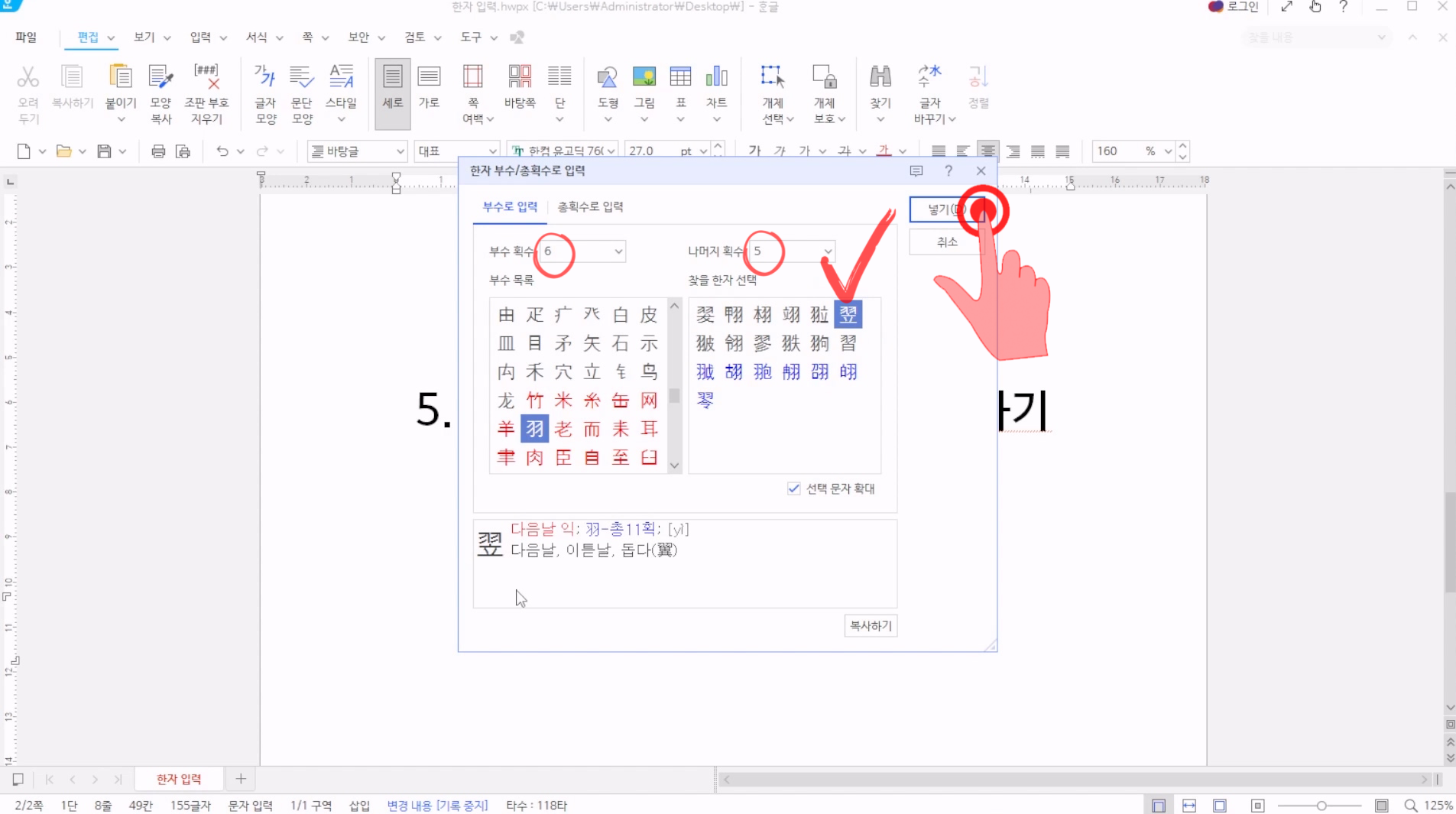 총획수로 한자를 입력하려면, 총횟수를 입력하고 해당 한자를 찾아서 [넣기]를 누르면 된다.