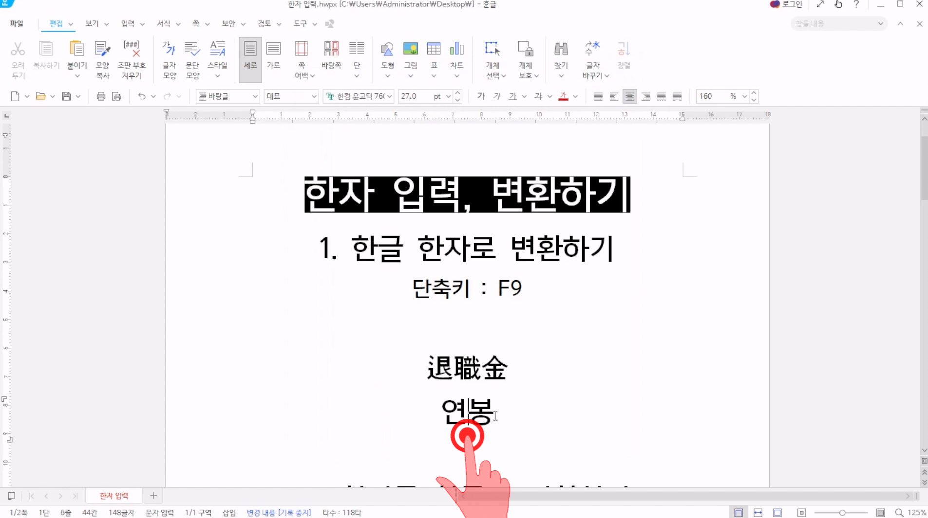 두번째, 한글 단어를 한글자씩 한자로 변환하는 방법이다. 한글단어 사이를 선택한 후 F9를 눌러보자.