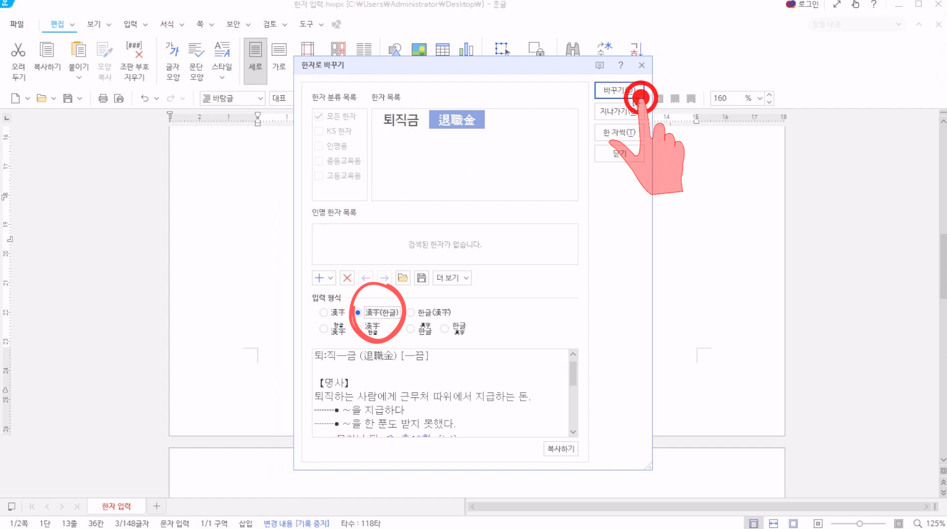 다음, 팝업된 창의 [입력형식]을 [한자]로 선택하고, 변환하고자하는 한자가 맞으면 [바꾸기]를 누르자. 만약 한글단어를 선택하고 한자를 변경하려고 할때 원하는 한자단어가 없는 경우가 있다. 이 경우는 다음에 나오는 한글자씩 한자로 변환해야 한다.