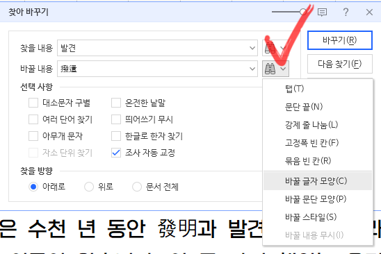 [바꿀 내용]의 끝부분의 아래화살표를 누르면 아래와 같이 변경할 내용의 포맷을 설정하는 창이 나온다.