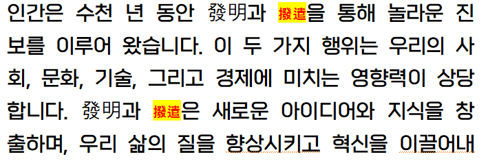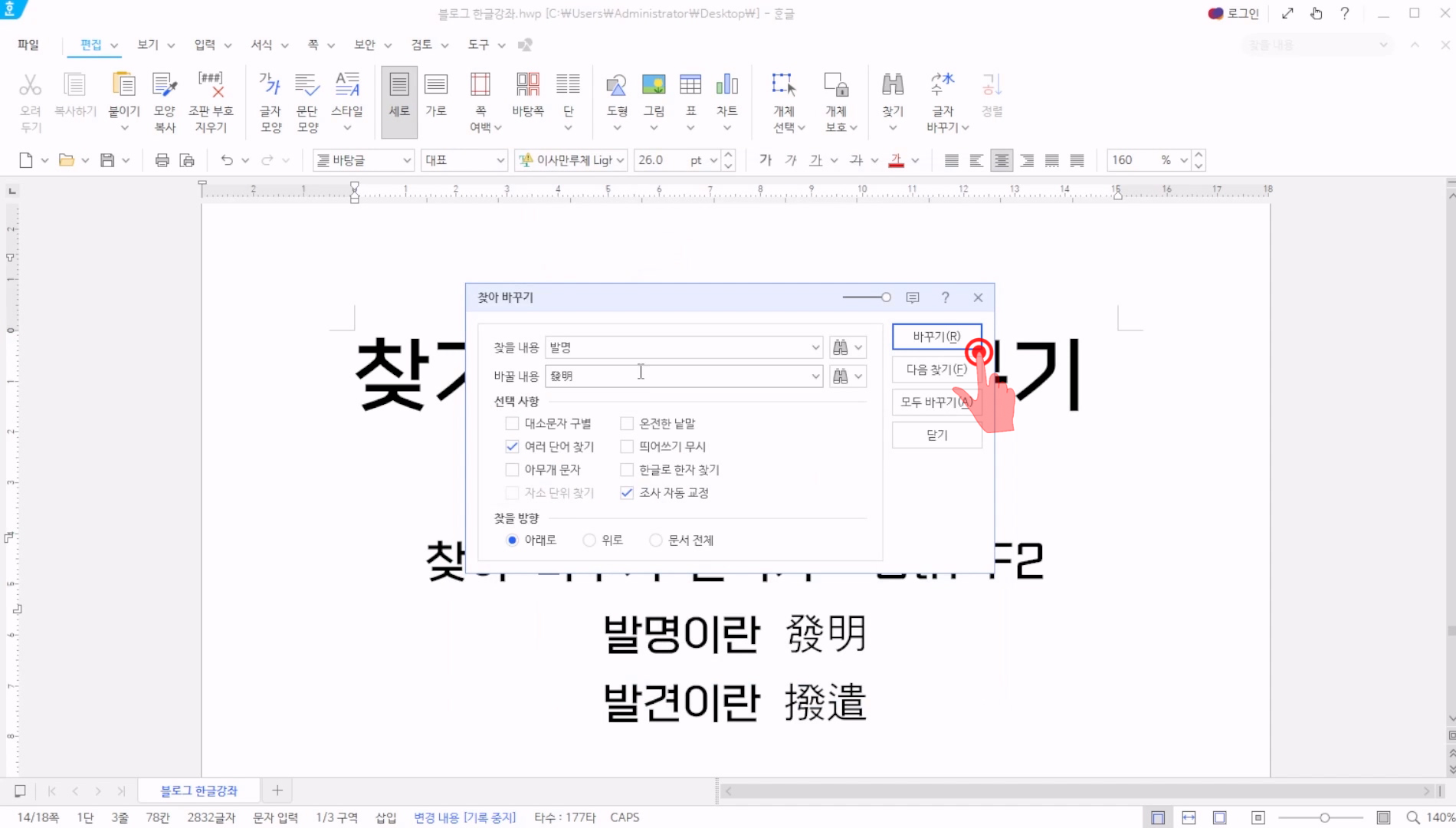 아래에서는 발명을 찾아서 한자로 입력했고, [바꾸기]를 눌러 한 단어씩 검색하면서 글자를 변환했다.
