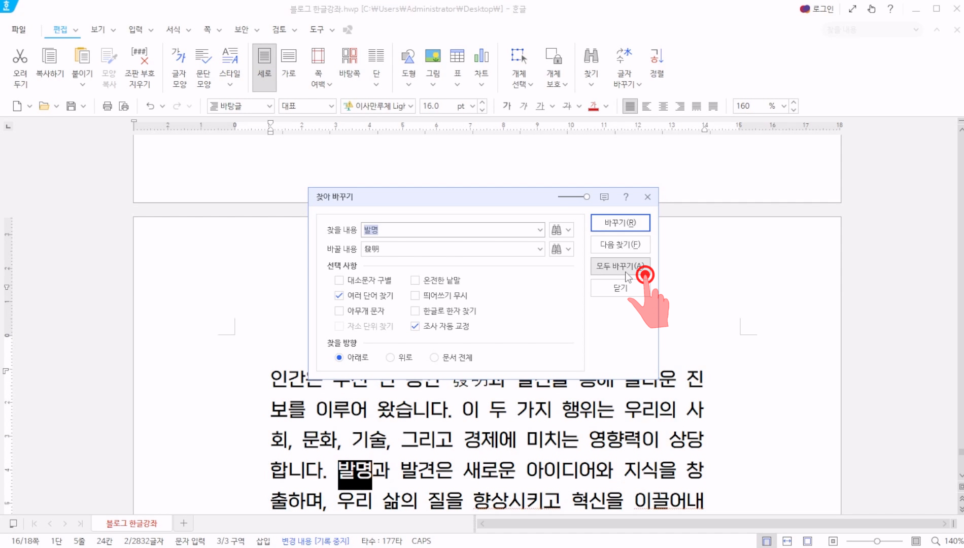 만약에 글자를 한꺼번에 다 바꾸려면 [모두 바꾸기]를 클릭해주면 된다.