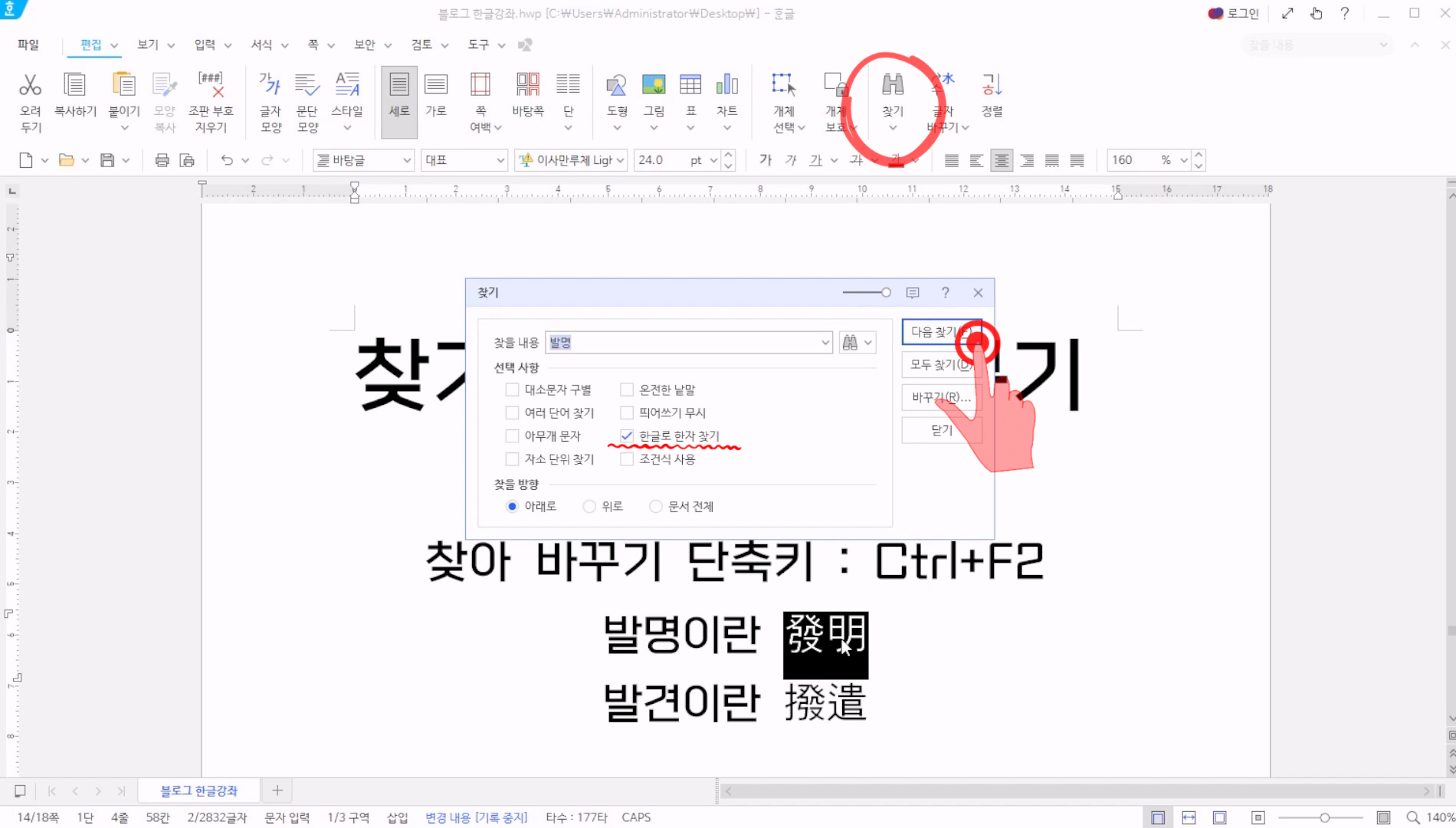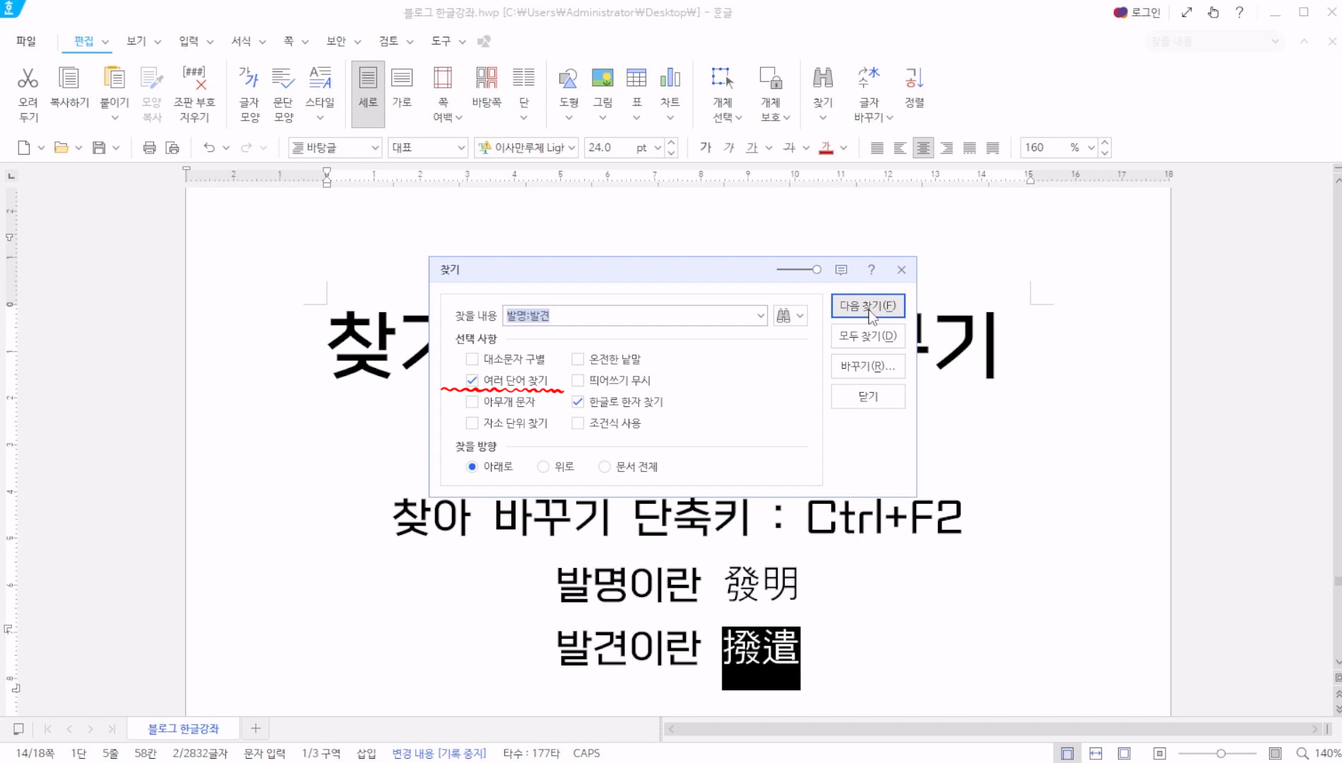 한글 찾기의 단축키는 Ctrl+F이다. 이 정도는 대부분 알고 계시리라 생각된다. 하지만 아래에서 소개하는 이 기능을 활용하시는 분은 많지 않으리라 생각된다.