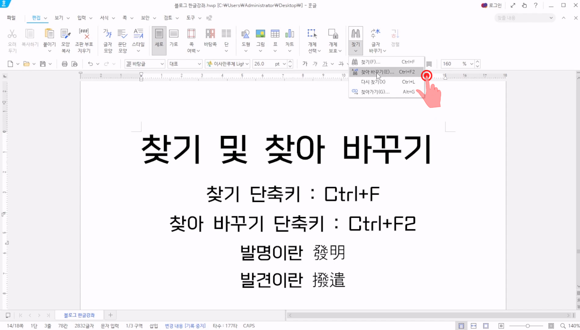 한글 찾아 바꾸기는 [찾을내용]과 [바꿀내용]을 입력하여 바꾸는 기능으로, Ctrl+F2를 누르거나, [편집]-[찾기]-[찾아바꾸기]를 누르면 된다.