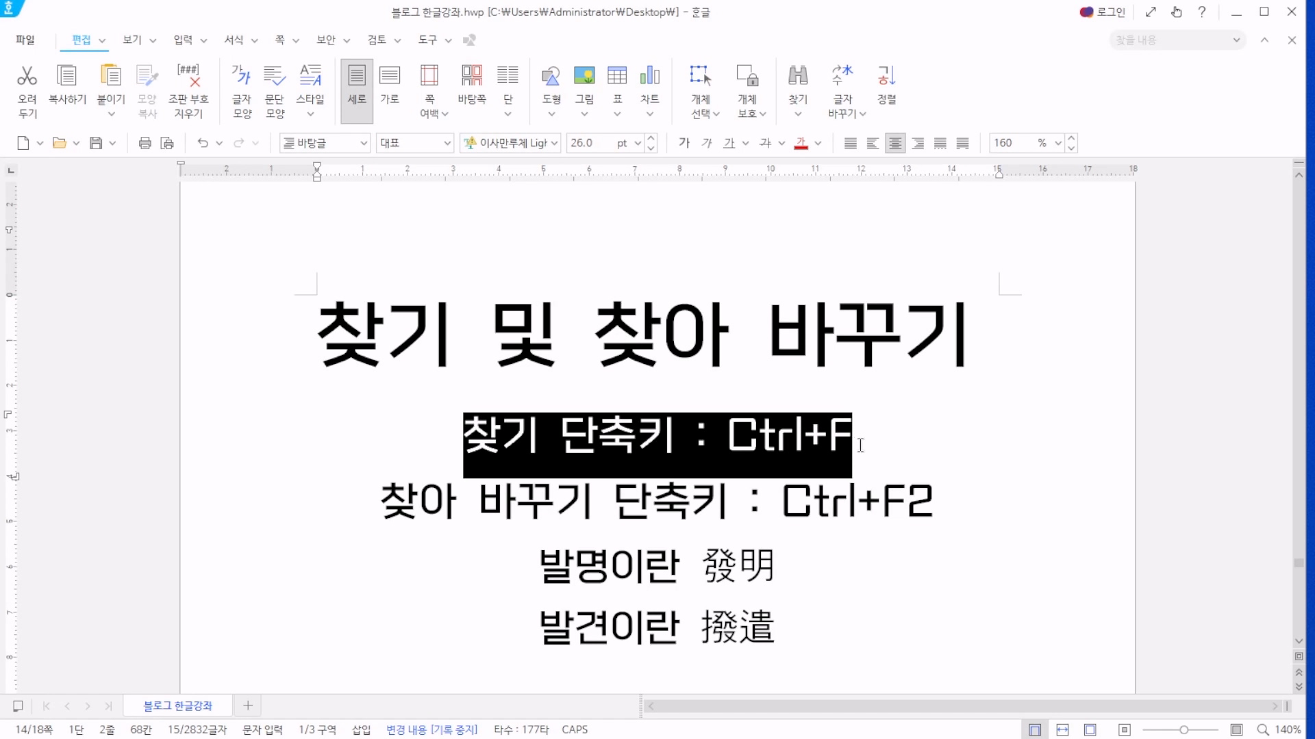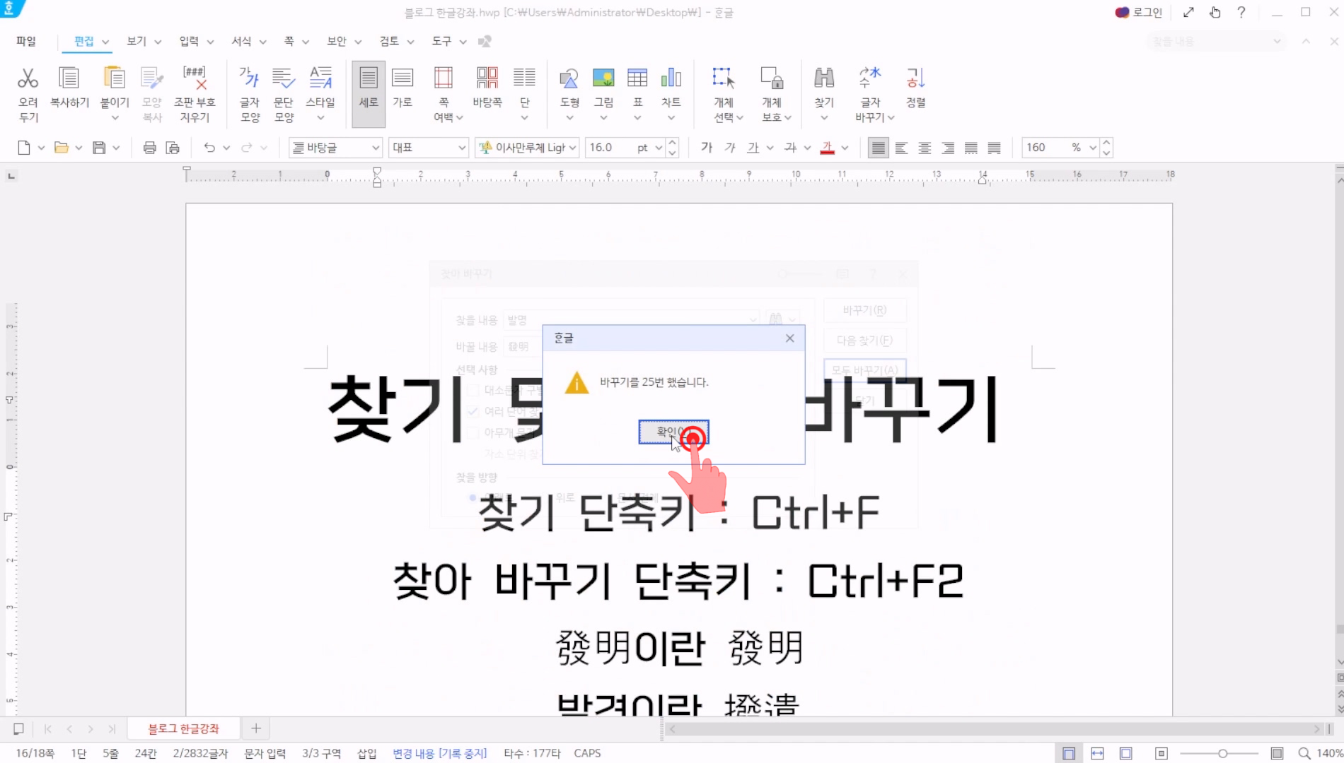 오늘은 한글 찾기 찾아바꾸기와 그 단축키까지 알아 보았다. 찾아바꾸기는 글자모양까지 변경할 수 있는 강력한 기능이 있기 때문에 자세하게 알아두고 활용하면 좋겠다.