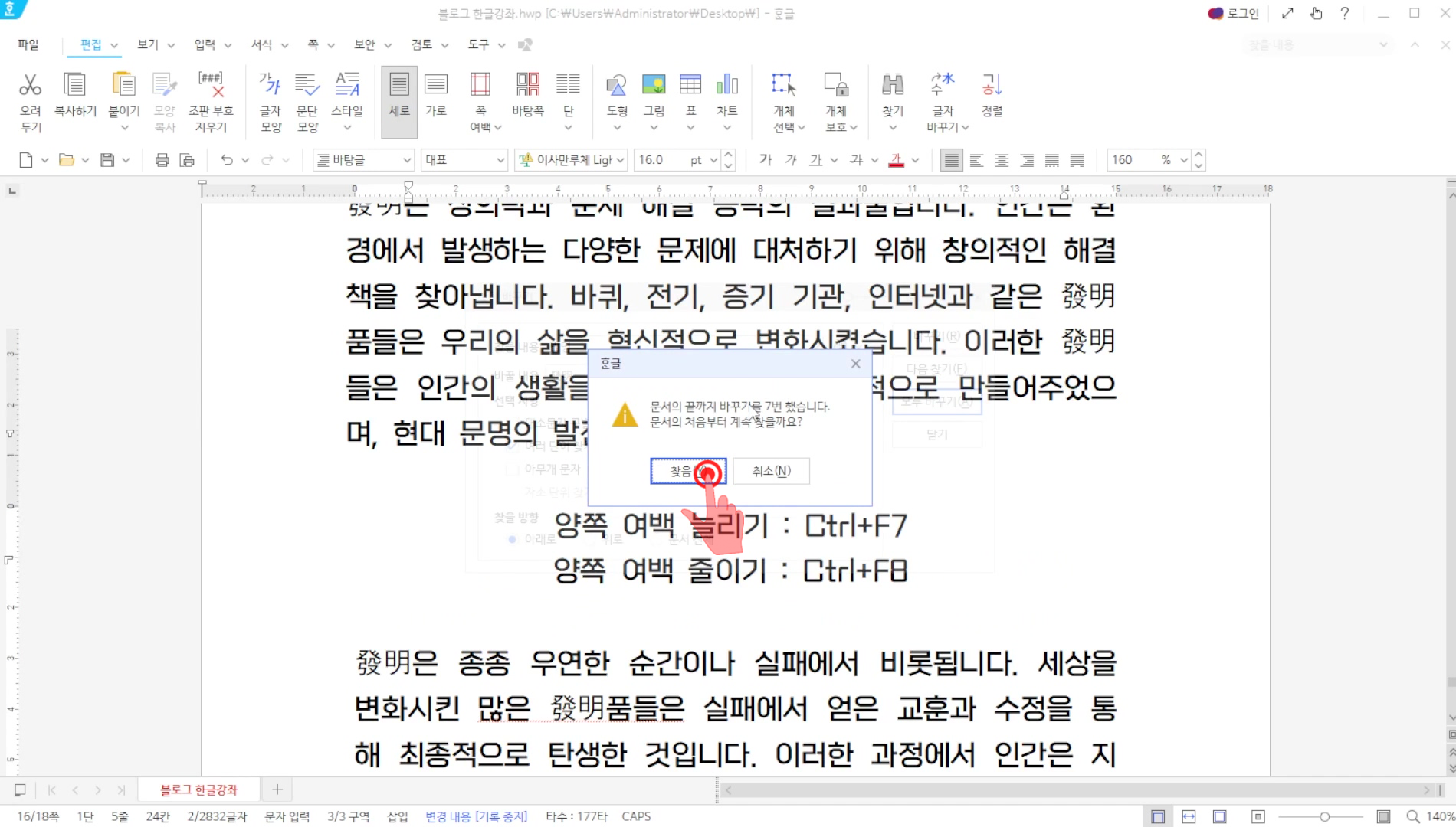 그러면 아래와 같이 문서끝까지 바꾸기를 해주고, 몇번 바꾸기를 했는지 알려준다. 그리고 문서의 처음부터 계속 찾아서 바꿀지를 묻는 창이 뜬다. 만약 처음부터 검색해서 변경하려면 [찾음]을 눌러주면 된다.