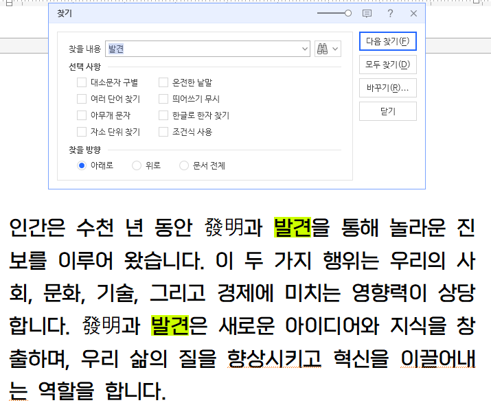 아래의 경우 [발명;발견] 으로 찾을 내용을 입력했고, [다음찾기]를 눌러서 검색을 한 것이다.