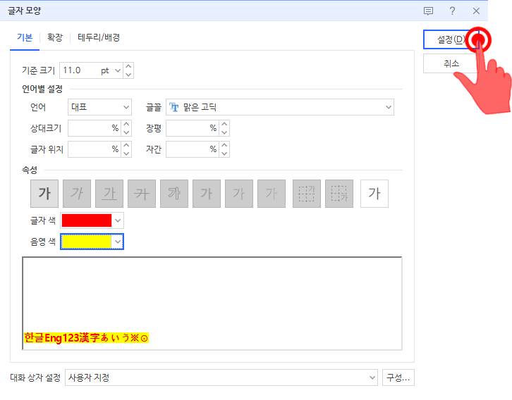 그리고 아래와 같이 글자의 크기, 글꼴, 글자색, 음영색 등을 선택한 후 [설정]을 누른다.