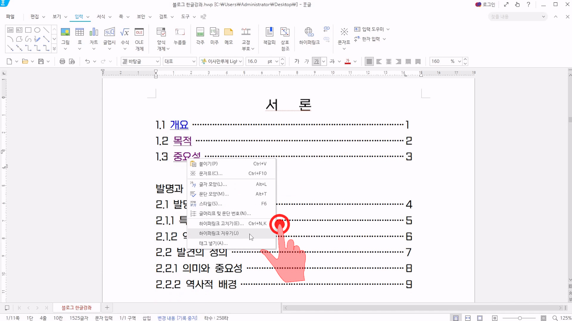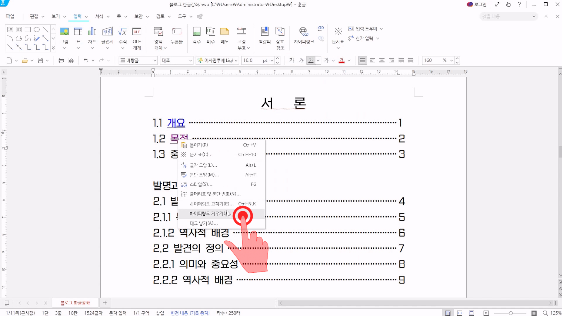 또는 하이퍼링크가 삽입된 단어위로 마우스를 가져간 후 오른쪽 클릭하여 [하이퍼링크 지우기]를 눌러도 된다.