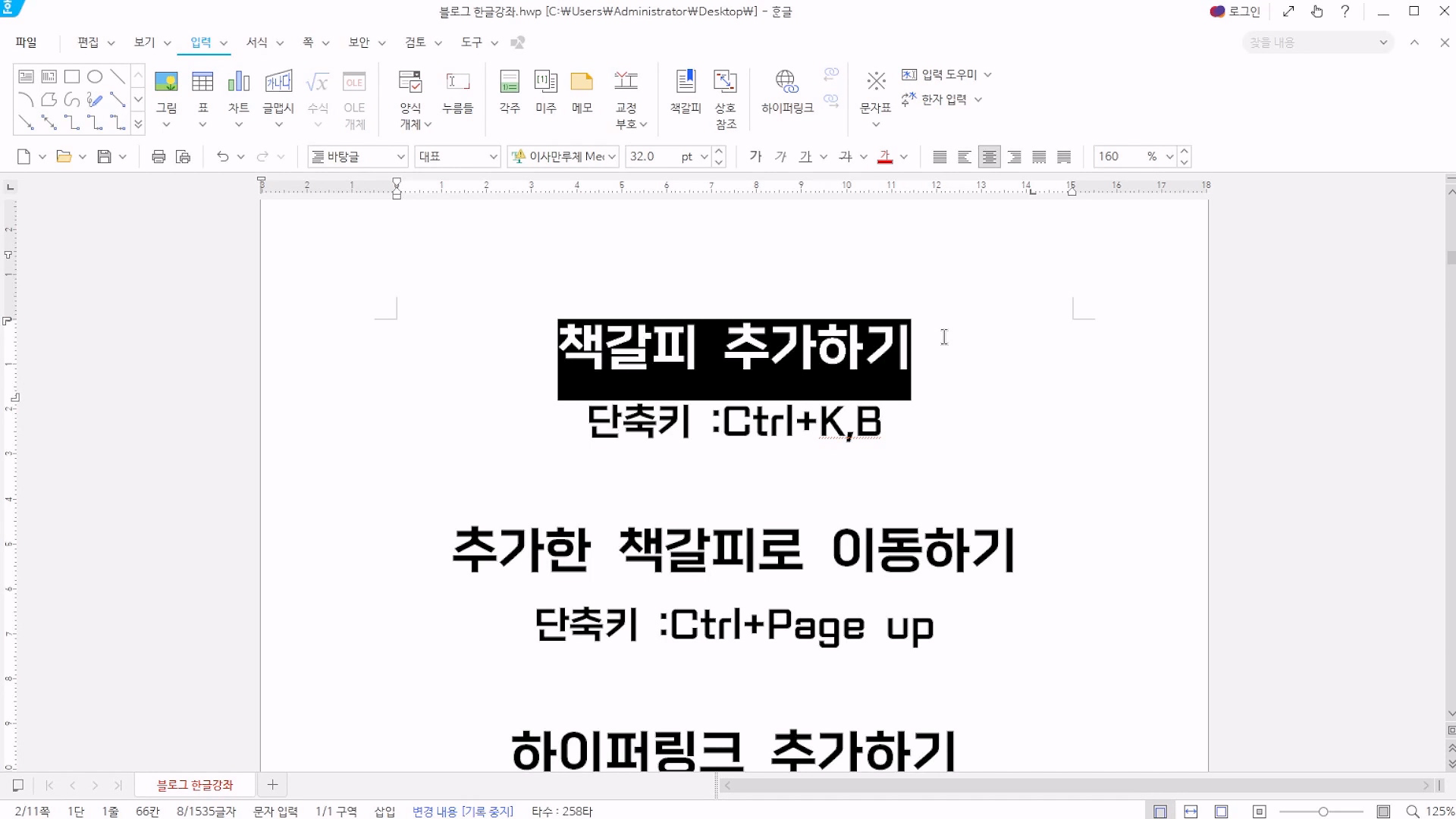 오늘은 한글 책갈피 하이퍼링크 넣기 수정 삽입에서 단축키까지 알아 보았다. 책갈피와 하이퍼링크는 문서의 페이지가 많아질 수록 유용한 기능이니 한번씩 사용해보자.