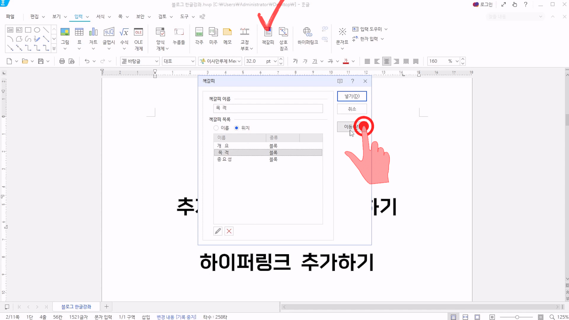 설정한 책갈피로 이동하는 방법은 매우 간단하다. 아래와 같이 [입력]-[책갈피]를 누르면 책갈피 창이 뜨는데, 자신이 이동하고자하는 책갈피를 선택한다. 아래의 경우[목적]을 선택했고, [이동]버튼을 눌러보자.