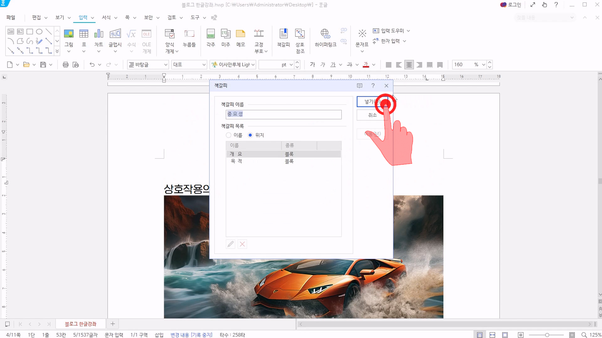 한글 목차를 만들고 나서 다음 해야할 일은 책갈피와 하이퍼링크를 추가하는 작업이다. 책갈피는 말그대로 문서의 일정페이지를 고정시켜주는 기능이고, 하이퍼링크는 이렇게 고정된 책갈피로 이동시키기 위해 글자나 사진에 연결을 하는 것을 의미한다.