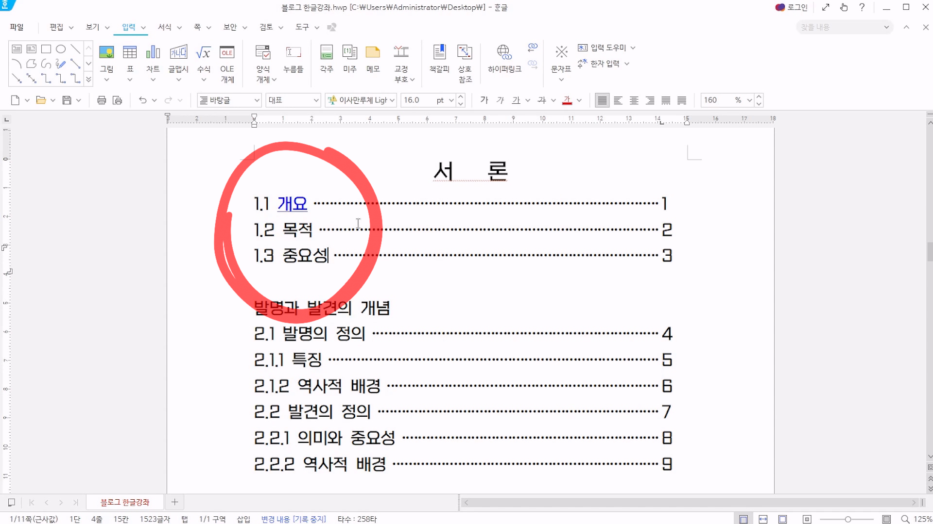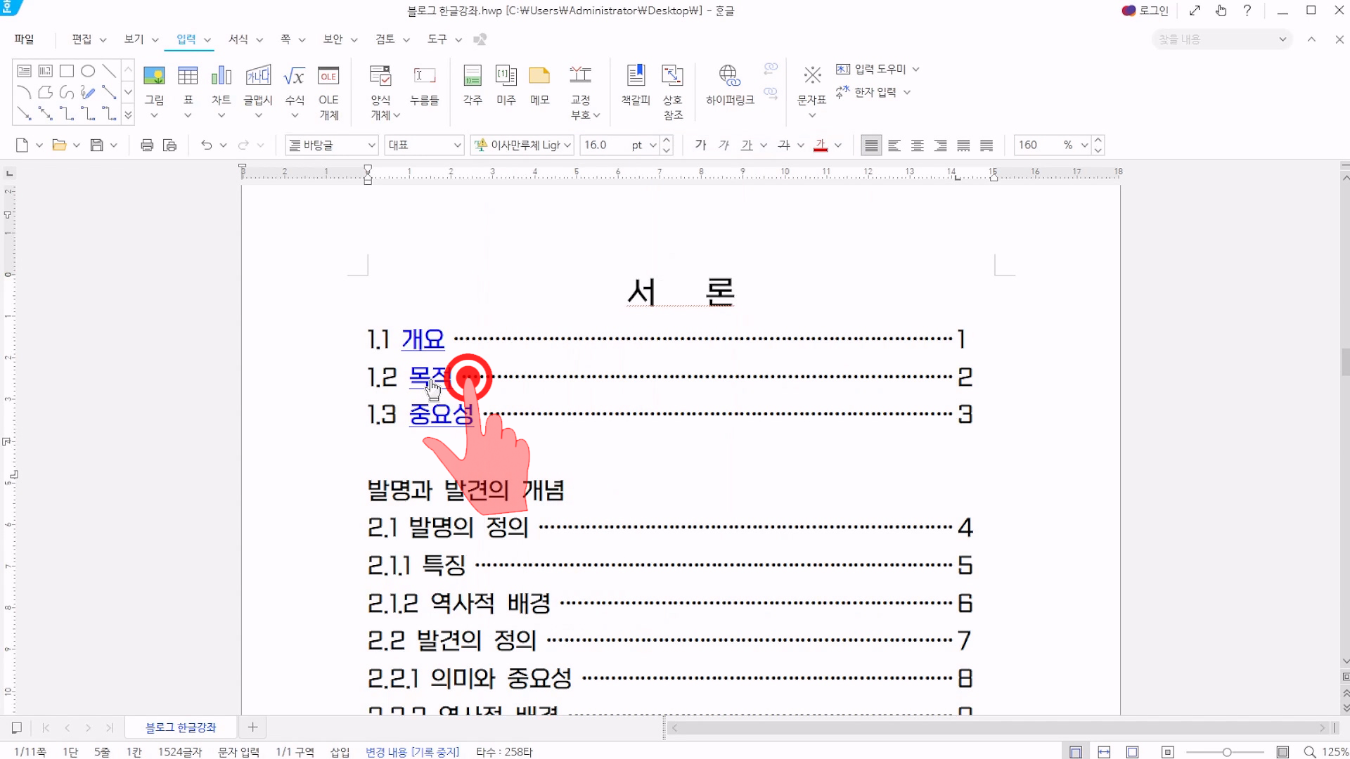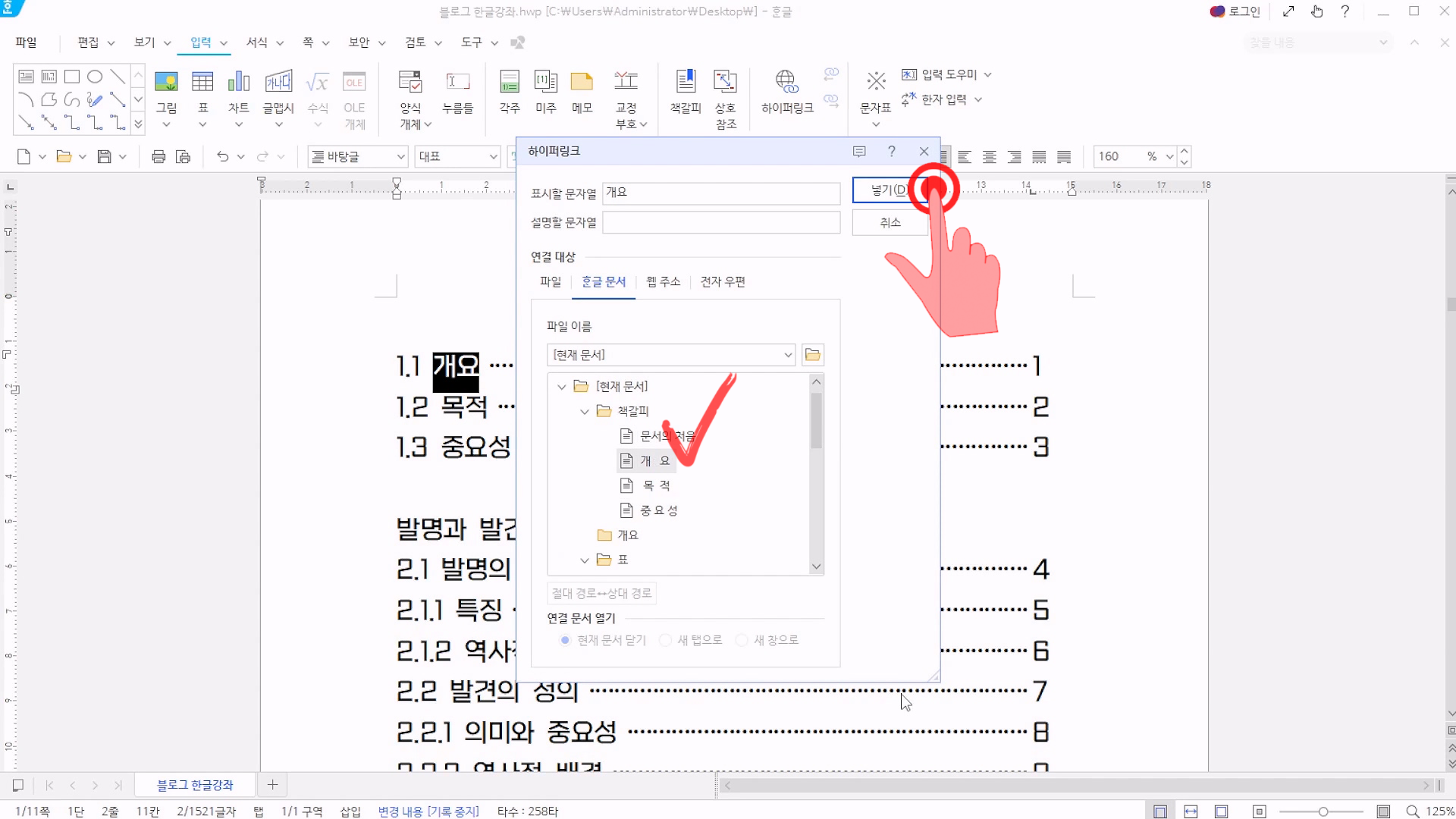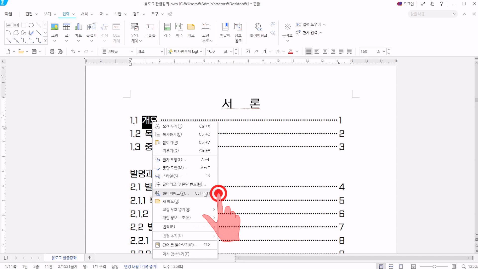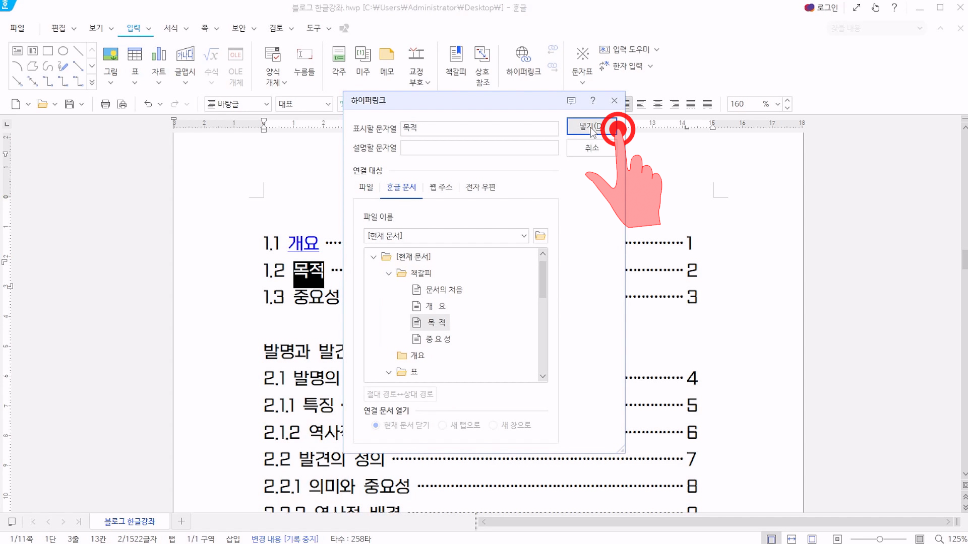 위에서 처럼 책갈피를 모두 추가했다면 이번에는 한글 목차의 하이퍼링크를 넣어보자.