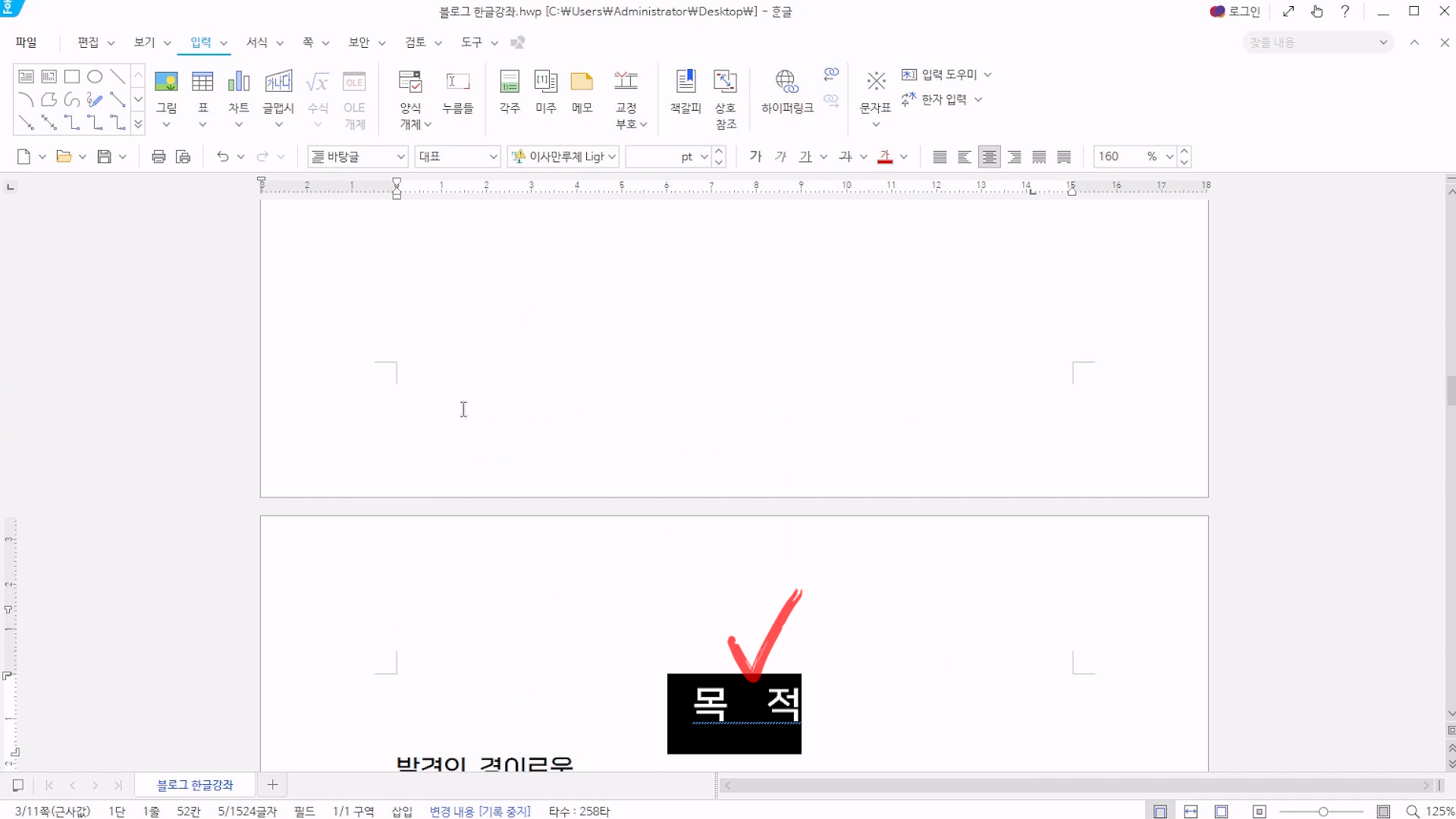그러면 본인이 설정한 [목적]페이지로 바로 이동할 수 있다. 이렇게 책갈피 위치로 이동하면서 자신이 설정한 책갈피 위치에 이상이 없는 지 테스트를 해보자.