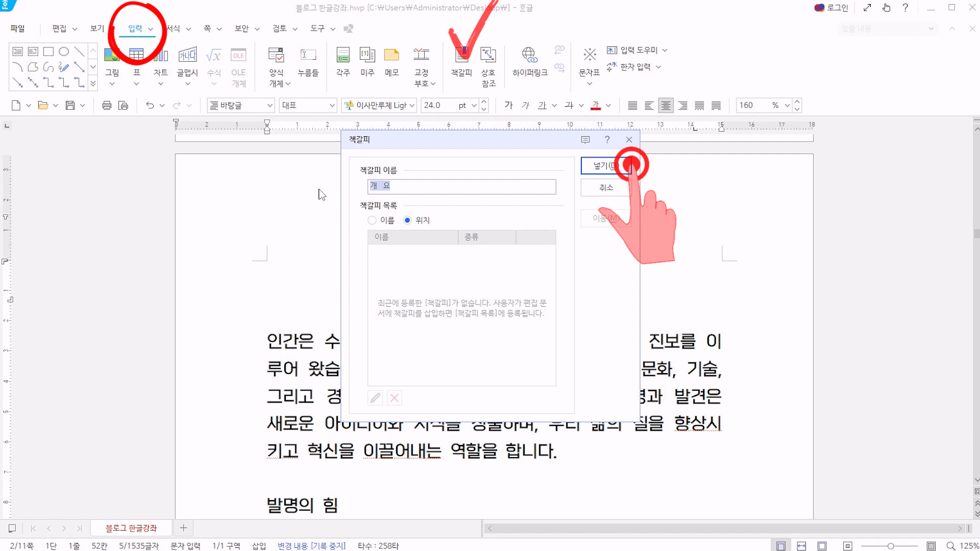 그리고 상단탭 중의 [입력]-[책갈피]를 클릭하자. 그러면 아래와 같이 책갈피 창이 뜨는데 여기에서 책갈피 이름을 입력하고 [넣기]를 클릭한다. 참고로 책갈피의 이름은 그 페이지를 대표하는 단어 그대로 입력하면 된다. 아래의 경우 [개요]페이지이기 때문에 이름은 그대로 [개요]로 넣었다.