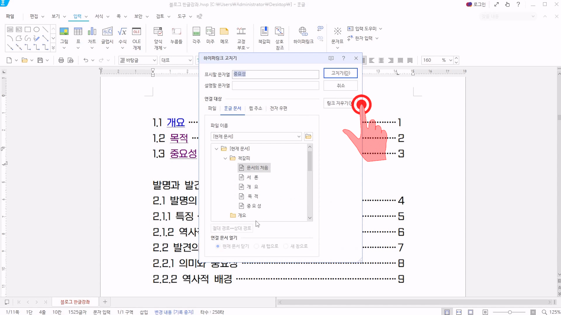 만약 이 하이퍼링크를 삭제하려면 바로 [링크지우기]를 눌러도 된다.