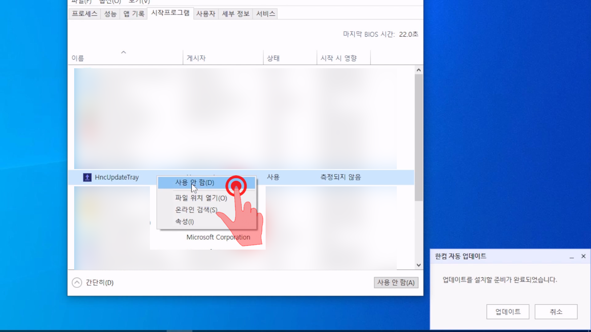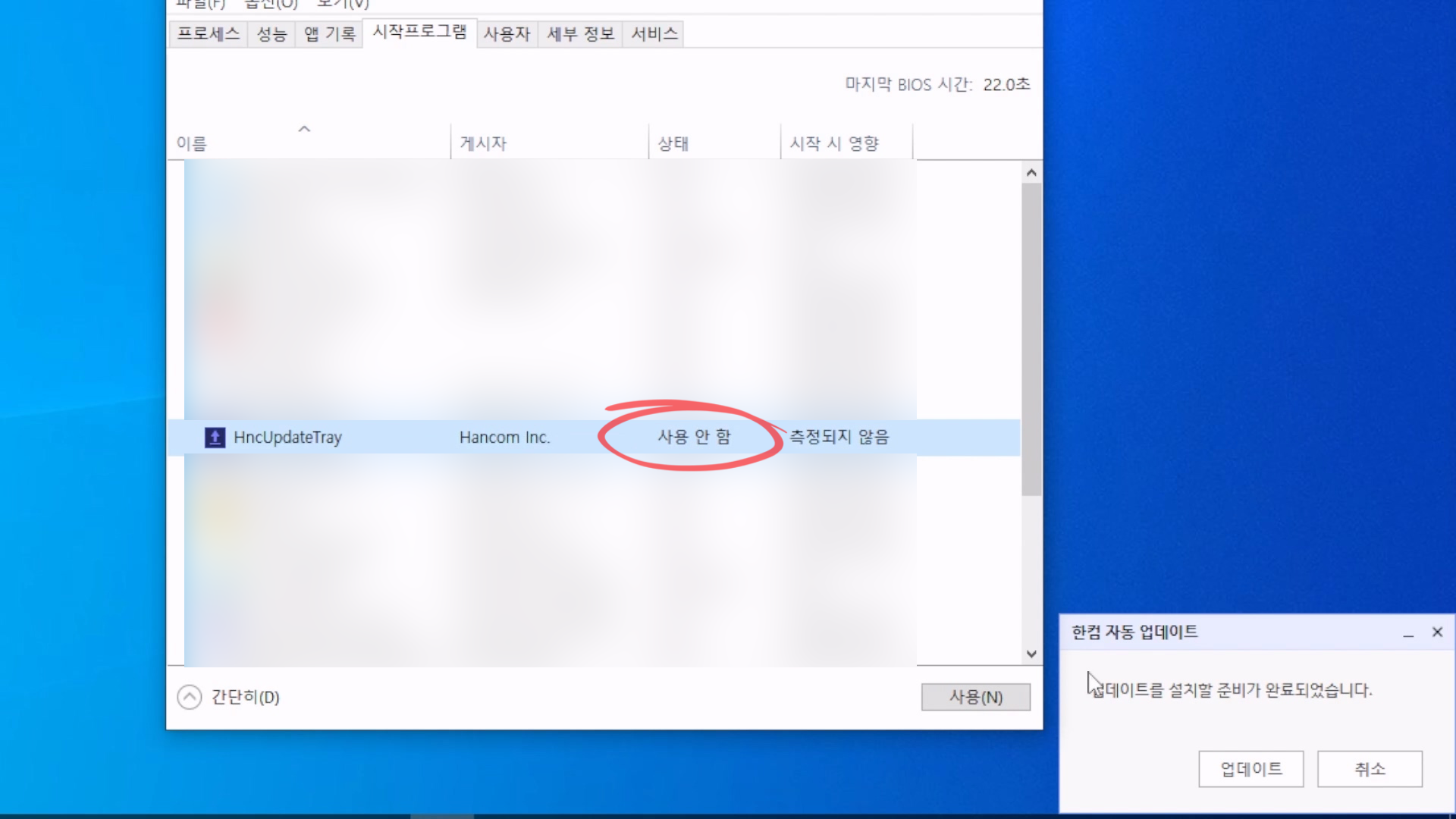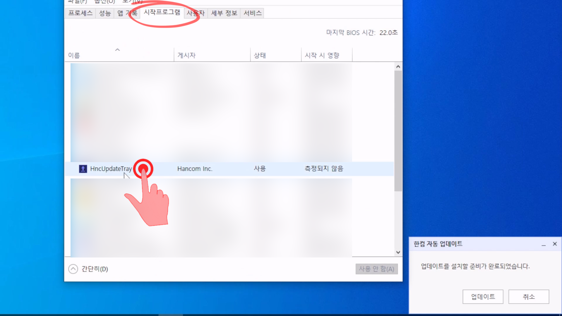 이중에서 [HncUpdateTray]이 보일 것이다.
