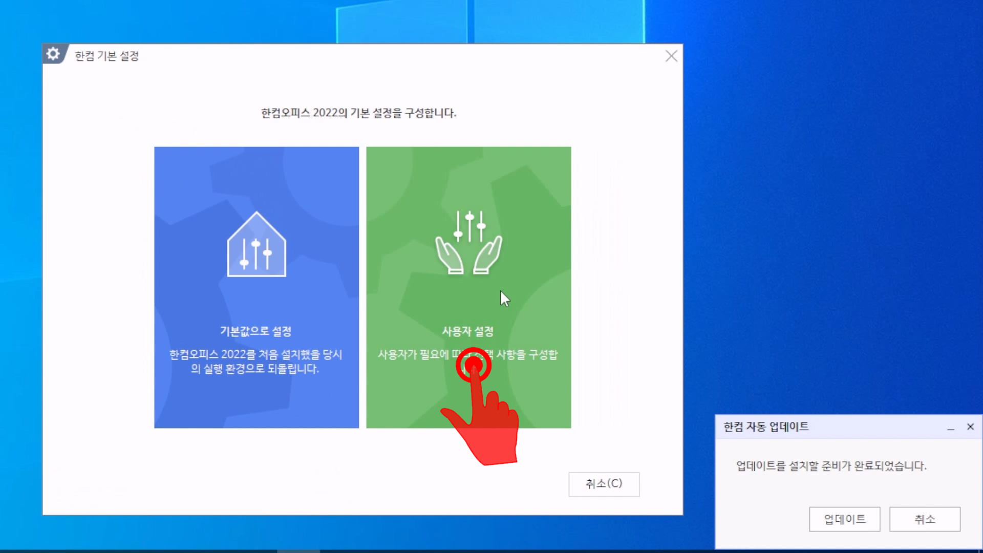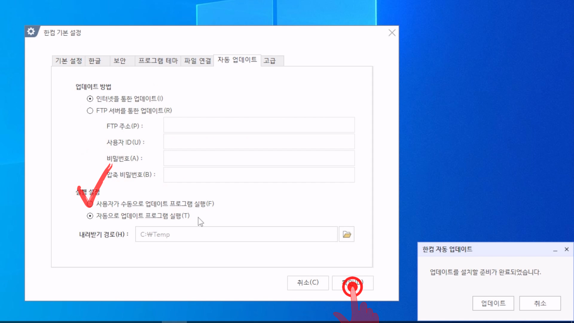 [한글 기본 설정] - [자동 업데이트] -[실행 설정] 에서 [사용자가 수동으로 업데이트 프로그램 실행]을 선택하자.