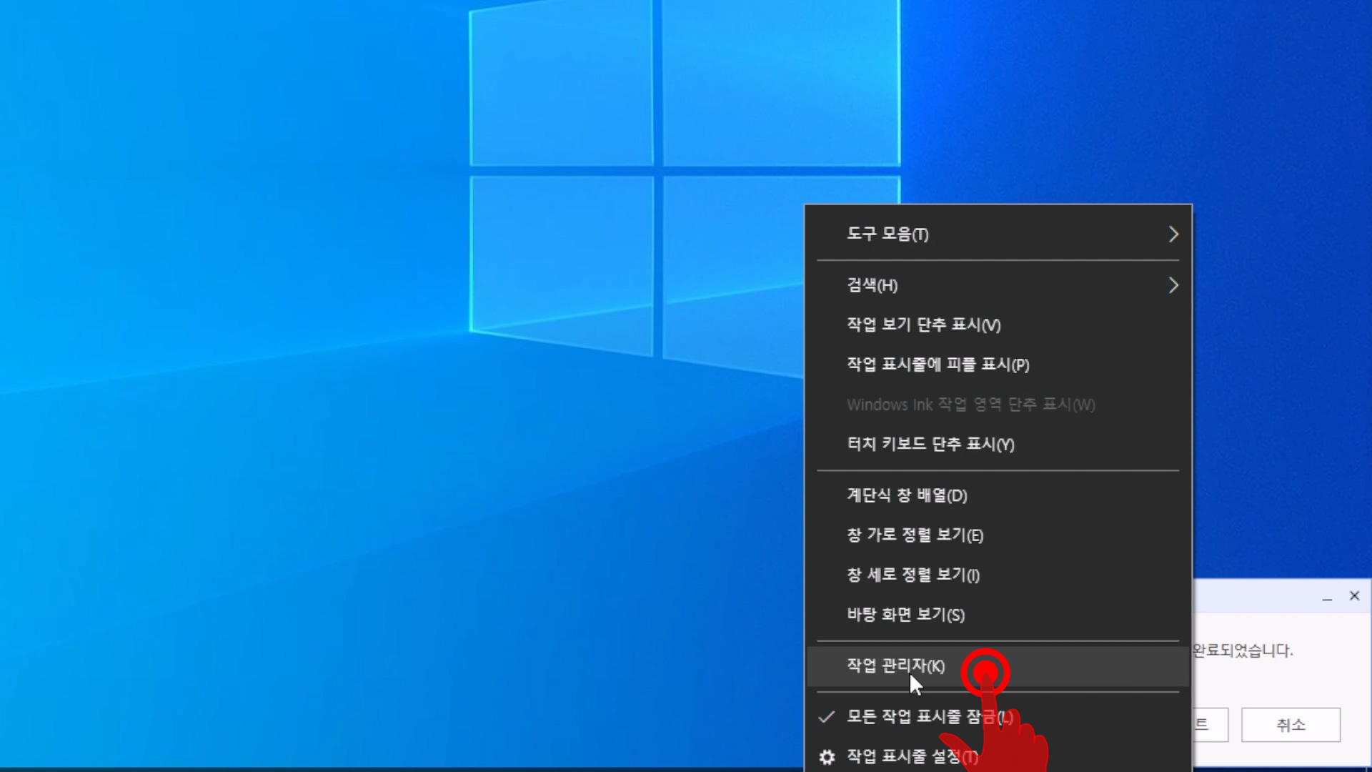 컴퓨터 하단의 [작업표시줄]에서 마우스 오른쪽 버튼을 클릭한 후 [작업관리자]를 실행하자.