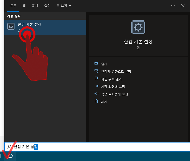컴퓨터의 왼쪽 하단의 [돋보기]를 눌러 [한컴 기본 설정]을 입력하자. 그리고 검색된 한컴 기본 설정 프로그램을 클릭하여 실행하자.